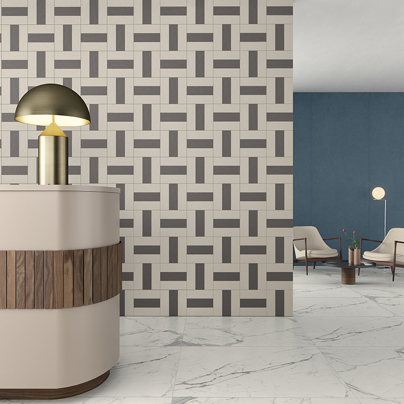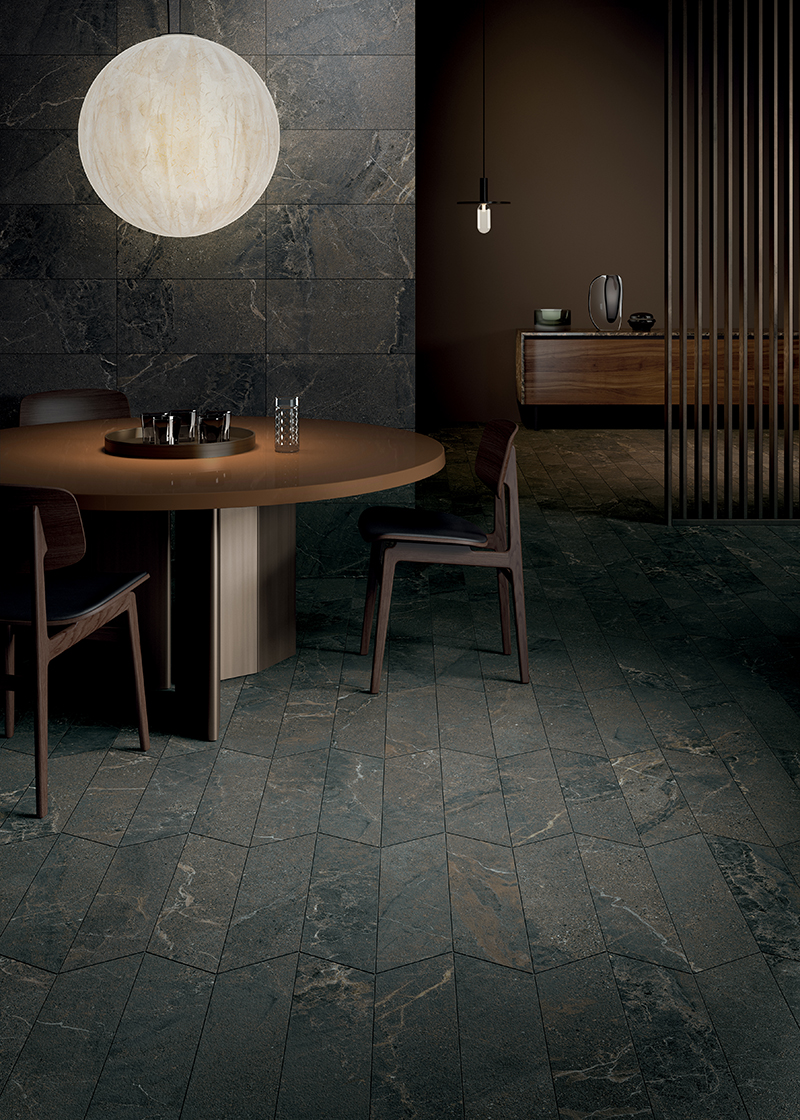 Infine, c’è un formato speciale, che può prestarsi per pavimentare spazi di qualsiasi estensione: lo chevron. Questo introduce un elemento di design antico e al tempo stesso modernissimo. La sua sagoma sovrappone al pattern grafico una griglia disegnata dalle fughe che apporta dinamismo ed eleganza alla pavimentazione.
