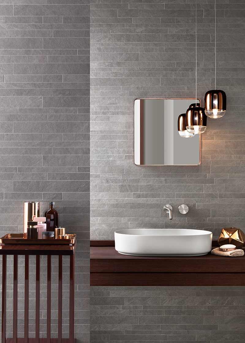 Alcuni effetti ceramici sono meglio espressi da piastrelle in formati rettangolari, altri dal quadrato, mentre per altri ancora il formato non incide direttamente nell’espressione dello stile. Una pietra con vene parallele o un effetto marmo direzionato (come il travertino) saranno valorizzati dal rettangolo, a prescindere dal fatto che scegliate piastrelle grandi o piastrelle piccole.