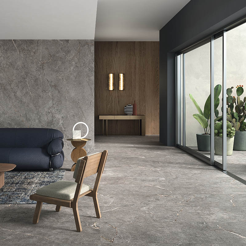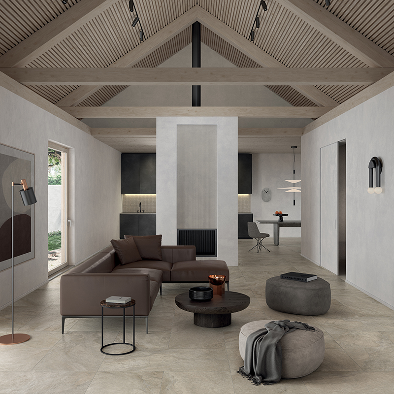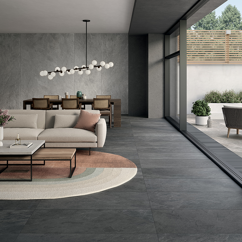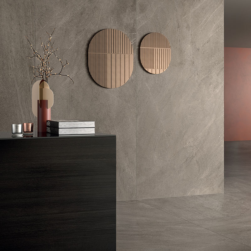 Le superfici in gres effetto pietra si distinguono per una vasta gamma di colori, formati e finiture. Il grande formato consente di progettare ambienti continui e minimali, riducendo le fughe e amplificando la percezione dello spazio.