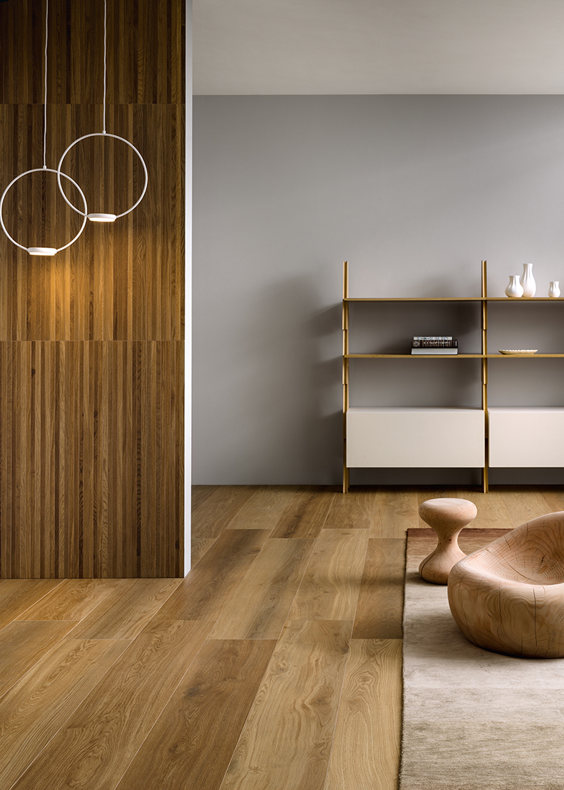 Tuttavia, una scelta più audace e decisamente innovativa è rappresentata dall'effetto legno. Le superfici in grès porcellanato che ricreano il legno presentano un'estetica più minimale rispetto a quella del materiale naturale. Catturando magistralmente l’essenza delle venature e dei nodi, restituiscono l’equilibrio di simmetrie del materiale naturale.