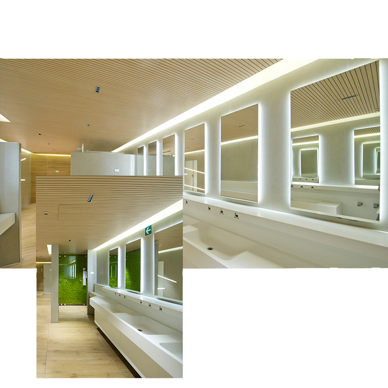 L’Aeroporto di Roma Fiumicino offre uno spazio toilette - progettato dallo studio Muzi&Associati - che per la sua eleganza è stato paragonato a una location esclusiva: il rivestimento è realizzato con Slimtech RE-evolution di Lea Ceramiche.