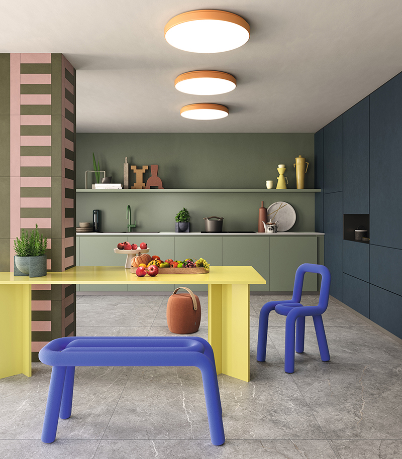 Firmata da Ferruccio Laviani, Pigmenti è una collezione-manifesto che trasforma il colore in materia pura. Le sue dodici cromie di tendenza – dai blu polverosi ai verdi salvia, dai terracotta caldi ai grigi urbani – danno vita a superfici sottili, leggere e dall’estetica delicata ma fortemente identitaria.