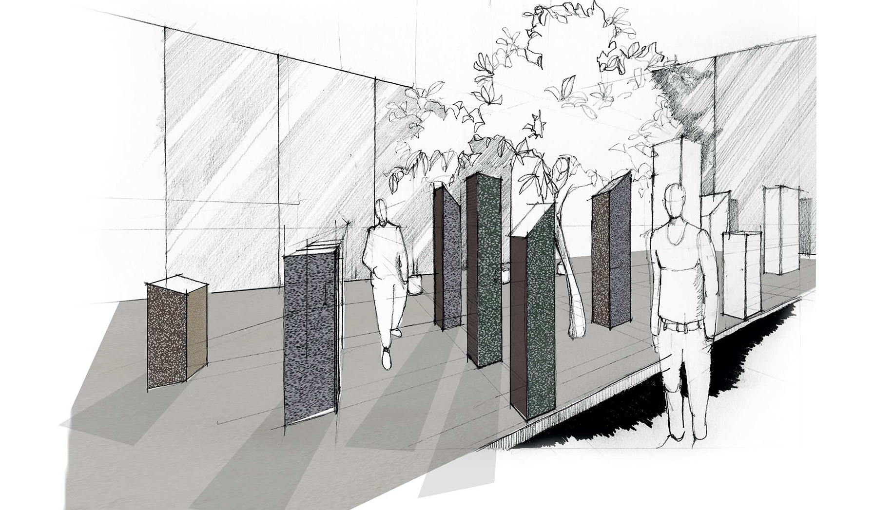Descrivere questo progetto è complesso pur nella sua semplicità: uno spazio pubblico occupato da un’installazione, un luogo contemplativo per pensare, riflettere ed essere riflessi, un paesaggio metafisico, un piccolo bosco architettonico, un panorama infinito…