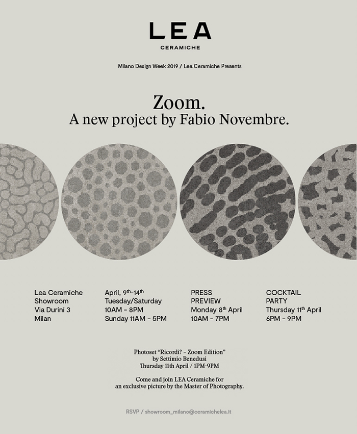 Per l’edizione 2019 del Fuorisalone, Lea Ceramiche presenta Zoom, una nuova linea di superfici ceramiche firmate da Fabio Novembre che arricchiscono ed ampliano l’impianto decorativo della collezione Concreto.