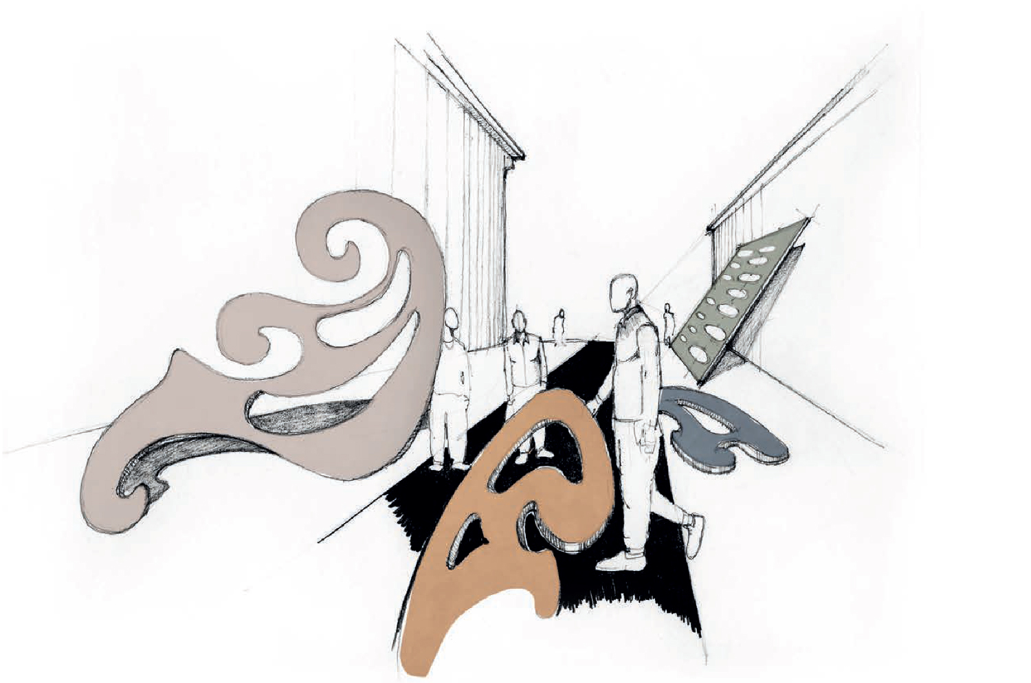 I colori, i decori e la matericità di Pigmenti, all’interno dell’installazione, descrivono cinque elementi, che danno forma, in versione over size, ai tradizionali e iconici strumenti di lavoro dell’architetto, da un gigantesco cerchiometro, a curvilinee di diverse forme e dimensioni.