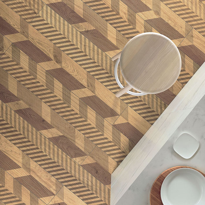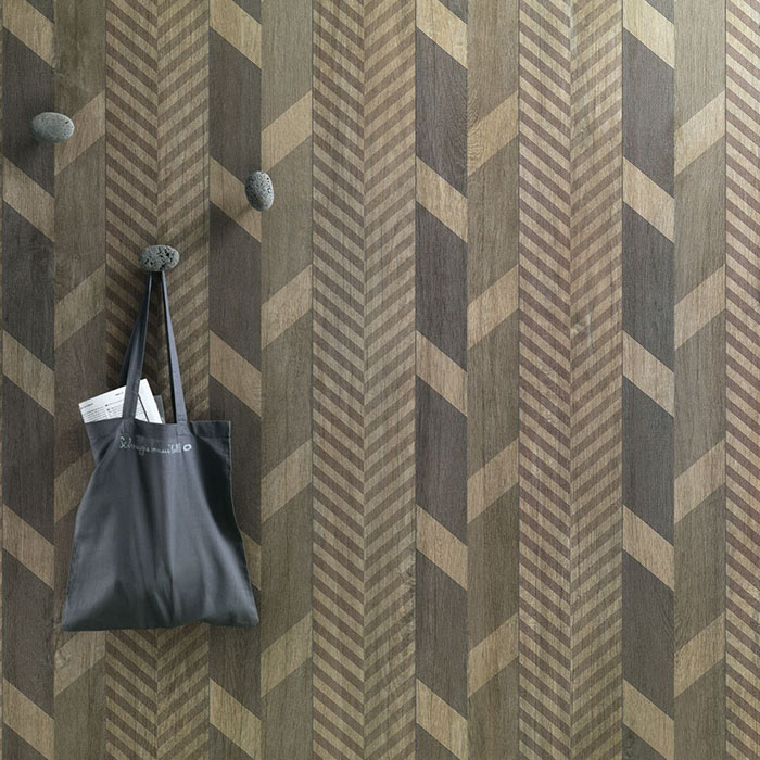 L’idea nasce dalla sovrapposizione di due layer. Il primo, più materico, è costituito da una serigrafia che gioca con il tema della verosimiglianza e riproduce un’essenza. Il secondo, più grafico, consiste in un decoro, basato sulla reiterazione della linea obliqua, declinato in quattro pattern.