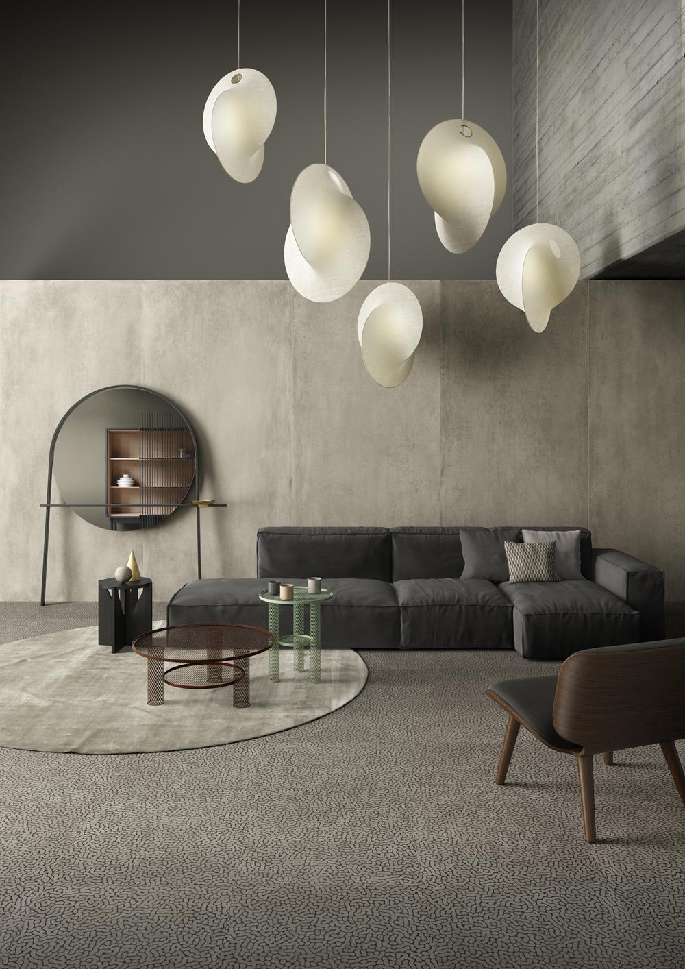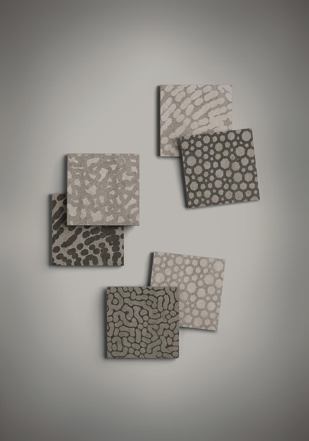 Nella decorazione di Concreto, Novembre declina il tema centrale dell’acqua, elemento organico del cemento, per trasformare la ceramica in una collezione materica in grado di adattarsi a qualunque contesto: mostrandosi nei suoi movimenti ondulatori (tide), nella sua assenza (dry), nelle trame degli esseri che la abitano (reef, foam) e nella gravità che la condiziona (drops).