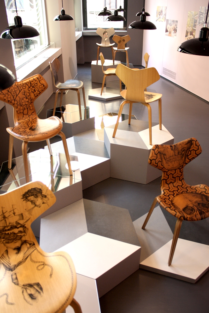 Fantastic Wood. Short novels for chairs è un progetto firmato dal designer Diego Grandi in collaborazione col tatuatore Pietro Sedda che che Fritz Hansen Store Milano presenta per celebrare il rilancio della sedia Grand Prix disegnata da Arne Jacobsen nel 1957 nella sua versione originale con le gambe in legno.