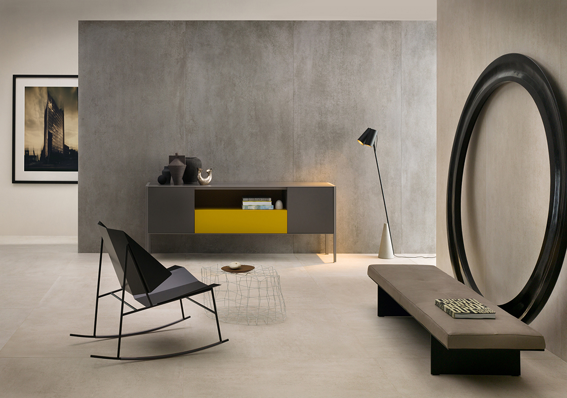 Con Concreto, Lea Ceramiche mette a punto una collezione integrale ispirata al cemento: articolata su tre spessori, su più finiture, più formati e più soluzioni decorative. Un progetto estetico, firmato da Fabio Novembre, che plasma il carattere di ogni ambiente, per spazi più intimi e privati, accoglienti, in un’armonia unica di minimalismo e design. Continuità e pulizia delle superfici, verticali e orizzontali; pareti monolitiche, pavimenti che dilatano gli ambienti, arredi: Concreto, nella versione Slimtech, dispiega le infinite possibilità delle grandi lastre di gres porcellanato sottile. E alle suggestioni del cemento, i complementi decorativi sovrappongono frammenti d’oro e tracce imprevedibili di un elemento vitale come l’acqua, nella sua naturale e organica interazione con la materia. I decori della gamma Zoom a spessore tradizionale, invece, si addentrano nella natura organica del cemento stesso, per scoprirvi imprevedibili geometrie naturali e farne ora tappeti grafici, ora una rivisitazione inedita delle tradizionali cementine da inserire a rivestimento.