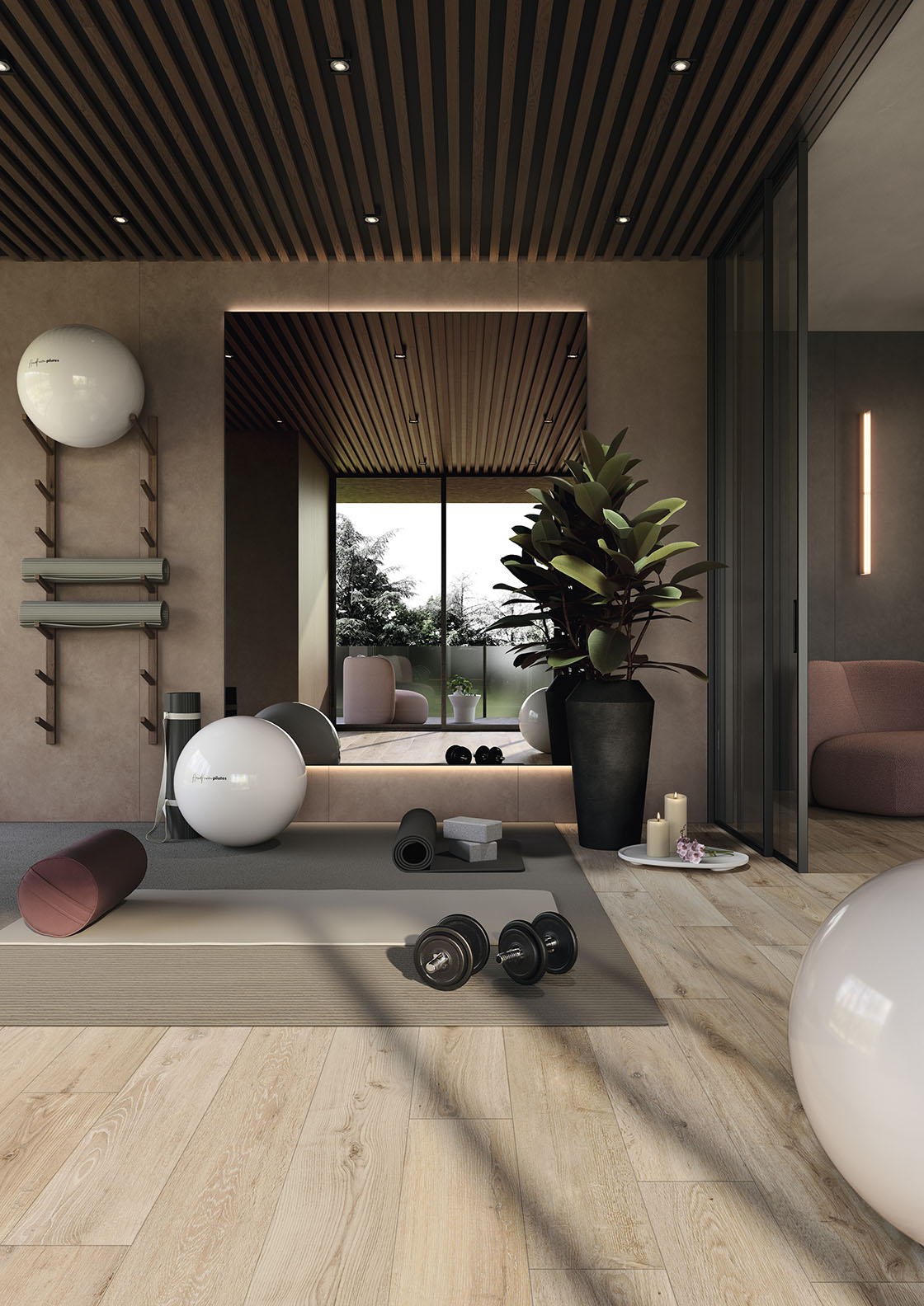 Il solo affinamento grafico consiste nell'accostamento di fibrature scure e di fibrature quasi bianche, tipiche dei legni trattati con cere naturali. Un tocco di misurata rusticità per un effetto legno dalla stonalizzazione contenuta e dall'eccezionale equilibrio compositivo.