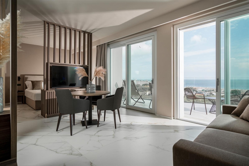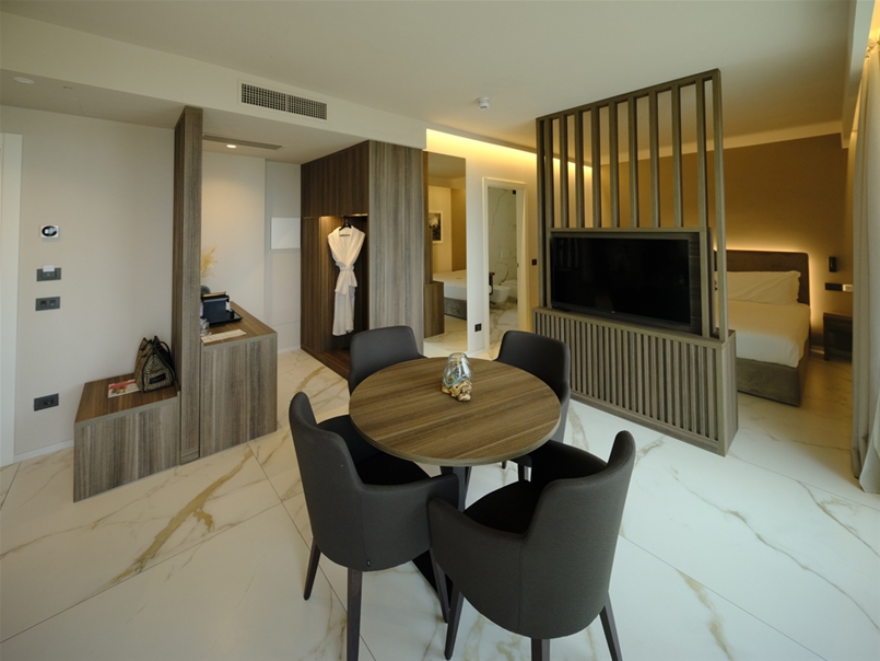Linee fluide, balconi curvilinei e grandi superfici vetrate disegnano un’architettura di pieni e vuoti, dove materia e trasparenza si incontrano in un equilibrio raffinato. L’edificio, articolato su nove piani, ospita 37 camere e quattro suite, culminando in una spa panoramica affacciata a 360° sull’orizzonte, dove la luce diventa materia e costruisce spazi di equilibrio, benessere e silenzio.