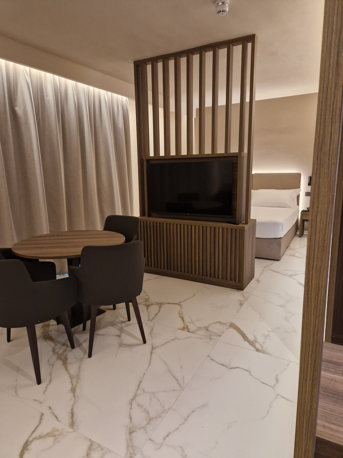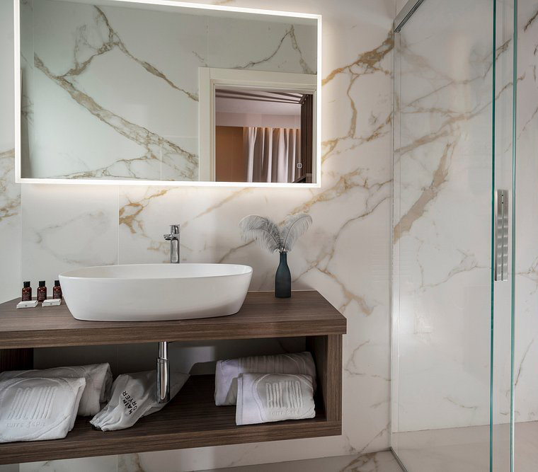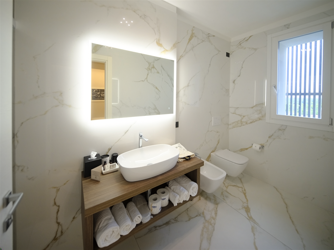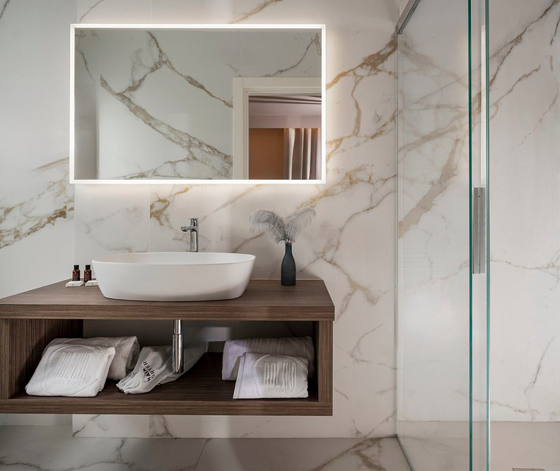 Le superfici Lea Ceramiche definiscono la cifra materica e sensoriale del progetto, accompagnando ogni ambiente con texture e finiture scelte per esprimere eleganza, coerenza e comfort. Negli interni, le suite e i bagni sono caratterizzati dalla collezione Noblesse – Calacatta Oro, utilizzata nella versione naturale per i pavimenti e levigata per i rivestimenti: un marmo ceramico luminoso e sofisticato che amplifica la percezione dello spazio e la qualità della luce.