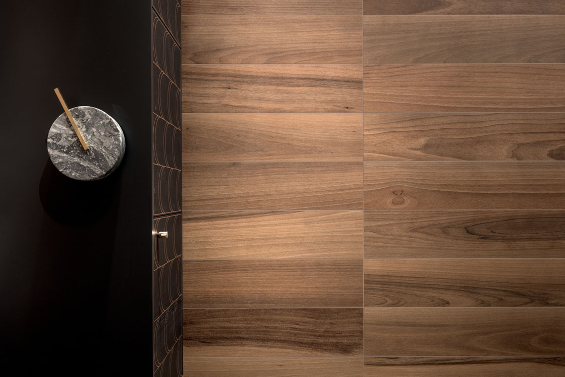 Nel ripensare gli spazi con l’obiettivo però di rispecchiare il carattere accogliente e fantasioso dei proprietari, per le aree comuni la scelta dei materiali a pavimento si è indirizzata su Lea Ceramiche, in particolare sulla collezione in gres porcellanato effetto legno, Bio Select. Le lunghe doghe nel colore Walnut Tobacco rimandano al calore dell’essenza lignea naturale; l’innovativa tecnica di stampa digitale riproduce sulla materia ceramica con estrema definizione, disegni grafici diversi l’uno dall’altro: grafica e struttura si fondono perfettamente quasi senza distinzione, semplificando il contrasto tra naturale e artificiale. La sapiente miscelazione di disegni lignei e cromie, restituisce nel caldo colore Walnutt Tobacco, moduli che richiamano uno stile classico, armonioso e naturale; le nuance a volte molto contrastate conferiscono alle superfici quell’atmosfera calda, inclusiva ed accogliente che rende l’Hotel de Noailles un piccolo gioiello nel cuore di Parigi.