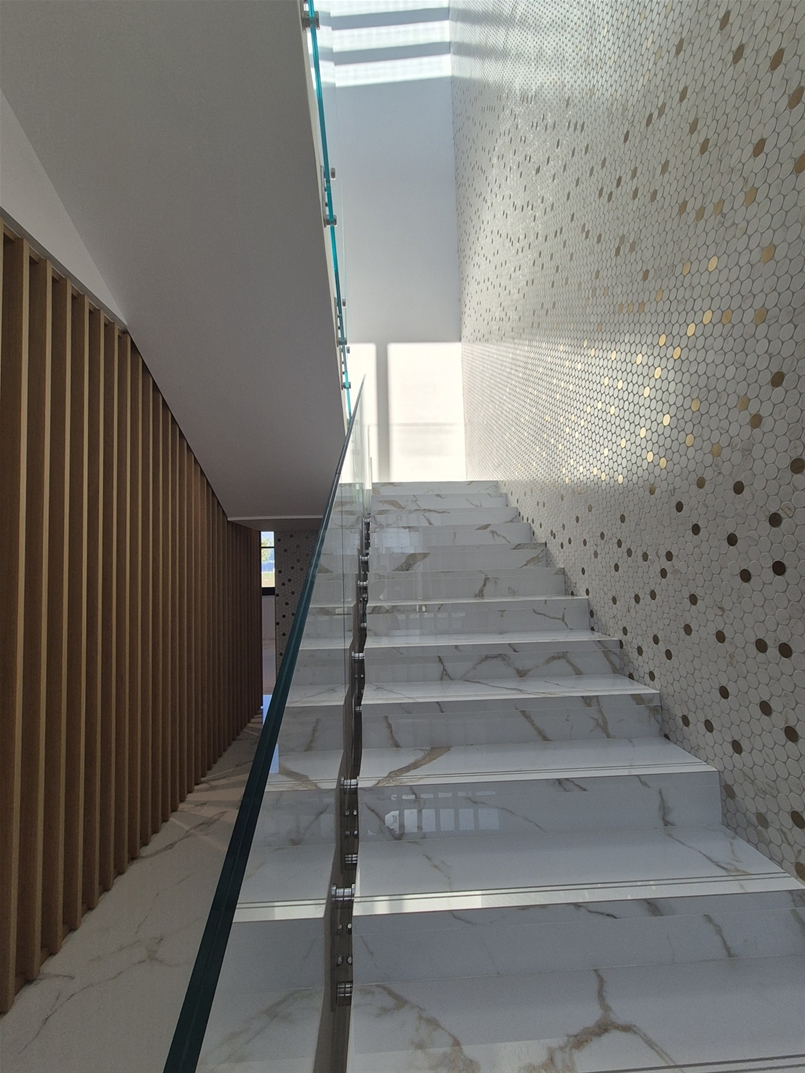 Le grandi lastre ultrasottili Slimtech definiscono pareti, zona lounge e percorsi direzionali con una presenza materica luminosa ed elegante, mentre gli elementi coordinati per la scala contribuiscono a costruire un linguaggio architettonico coerente e distintivo.