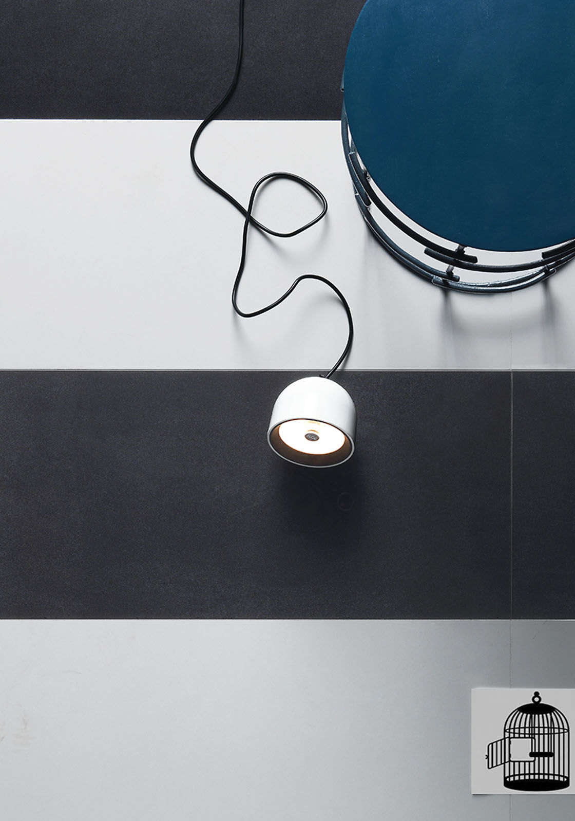 A pavimento, l’alternarsi del bianco e nero delle lastre Slimtech Absolute amplifica lo spazio e lo rende luminoso ed aperto grazie alla finitura lucida del gres laminato, ultima evoluzione della tecnica impensabile fino a poco tempo fa su spessori così ridotti.