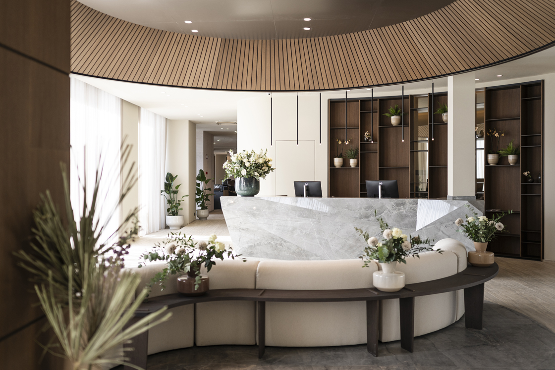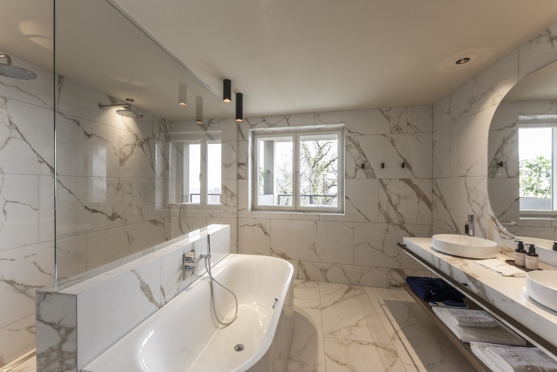 Protagonista del progetto è Noblesse, selezionata nella nuance Calacatta Oro, che definisce le Family Suite e il Family Chalet con un’eleganza classica e intramontabile. La stessa collezione, nella variante Gray Marble, scandisce la lobby, vero centro vitale della struttura: le grandi lastre Slimtech interpretano la monumentalità del marmo in chiave contemporanea, restituendo un’idea di lusso sottile, fatta di leggerezza e continuità visiva.