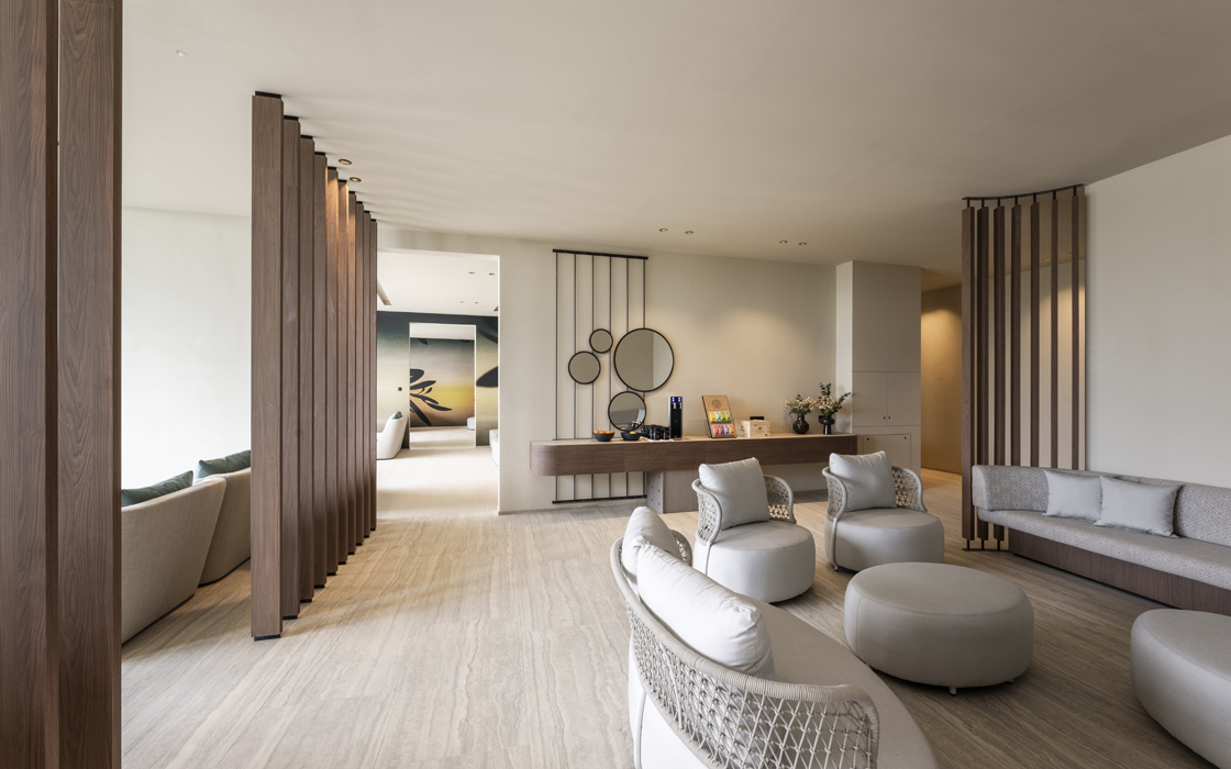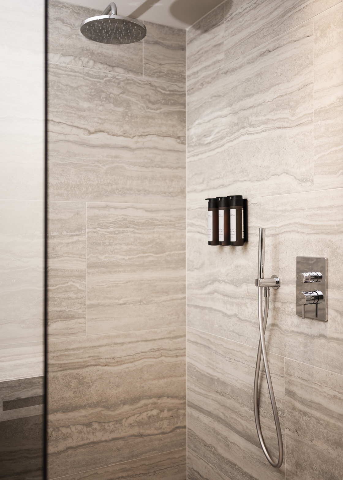 Per i rivestimenti delle sale bagno e per i pavimenti della Zona Relax Sauna & Fitness, è stata sviluppata una soluzione custom in grande formato, che coniuga resistenza e purezza estetica, confermando l’attitudine del brand a progettare su misura di ogni contesto.