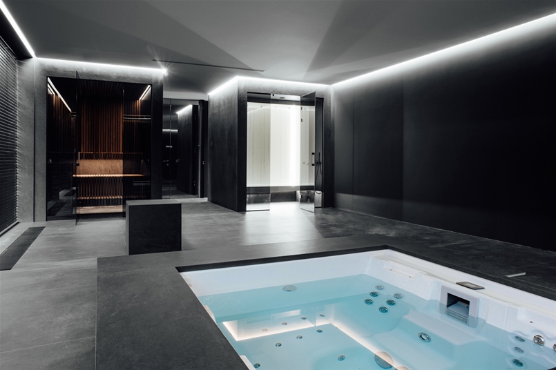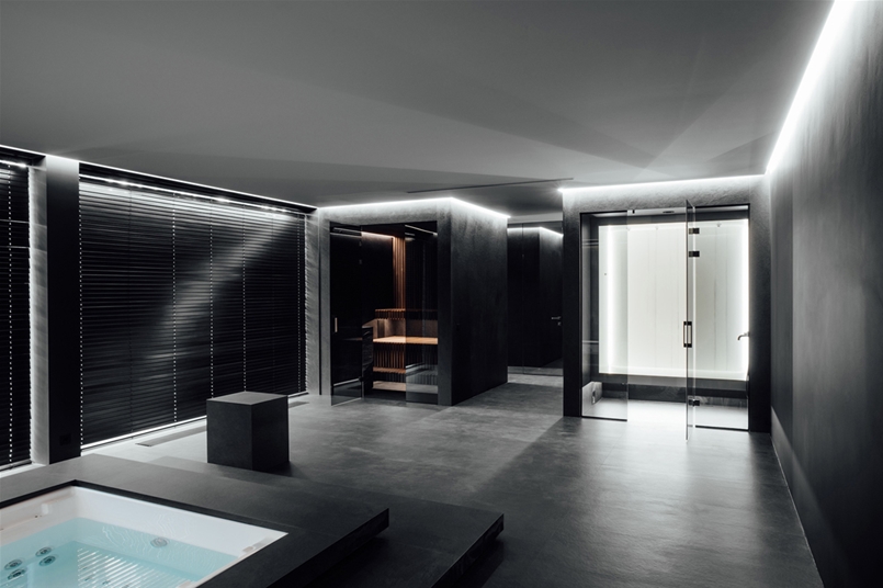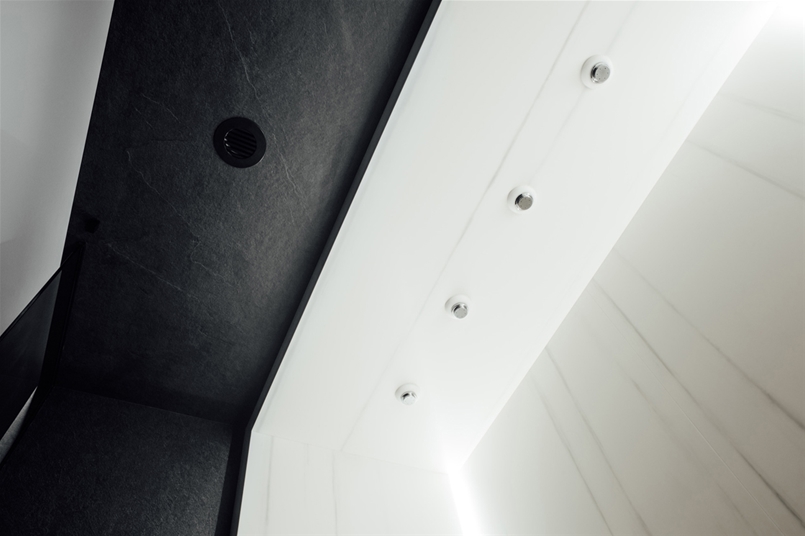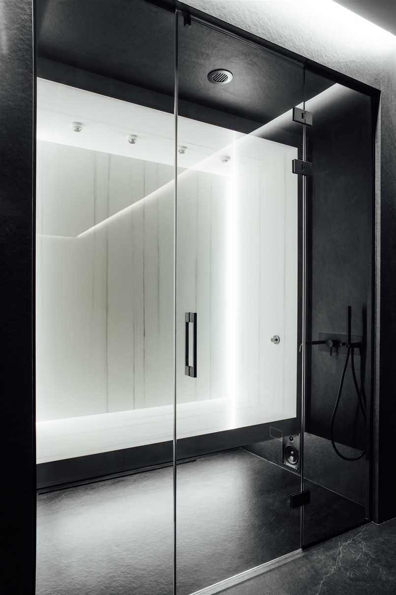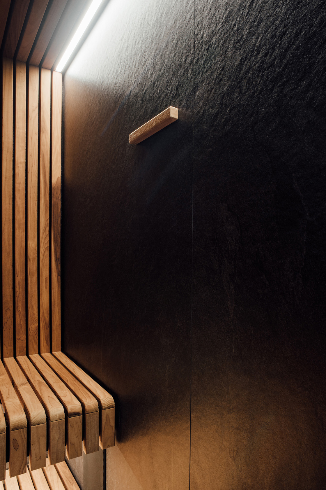 I materiali scelti per le finiture del bagno e dell’area Spa rispecchiano gli standard richiesti in termini di estetica, qualità e performance. Per i rivestimenti e per la pavimentazione sono state utilizzate le grandi lastre con formato 100x300 e 100x100 cm, sottili in gres porcellanato laminato della collezione Slimtech Waterfall che reinterpreta in modo realistico una pietra naturale e antica come l’ardesia. Proposta nella nuance antracite Dark Flow, la collezione ricopre le superfici degli ambienti, conferendo naturalità ed eleganza e creando un effetto grafico di grande impatto.