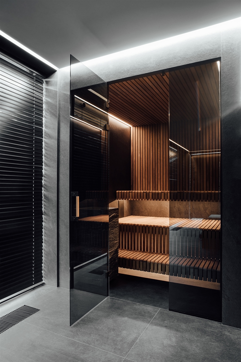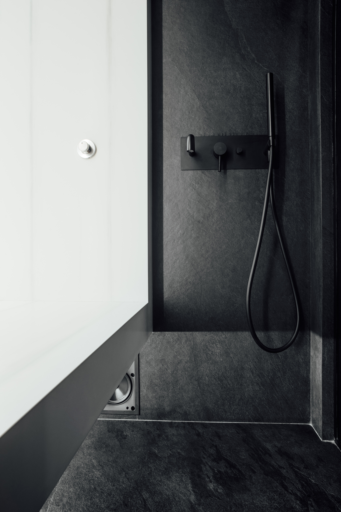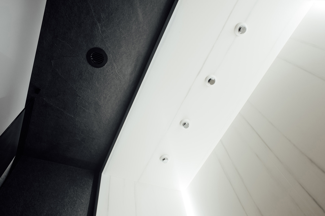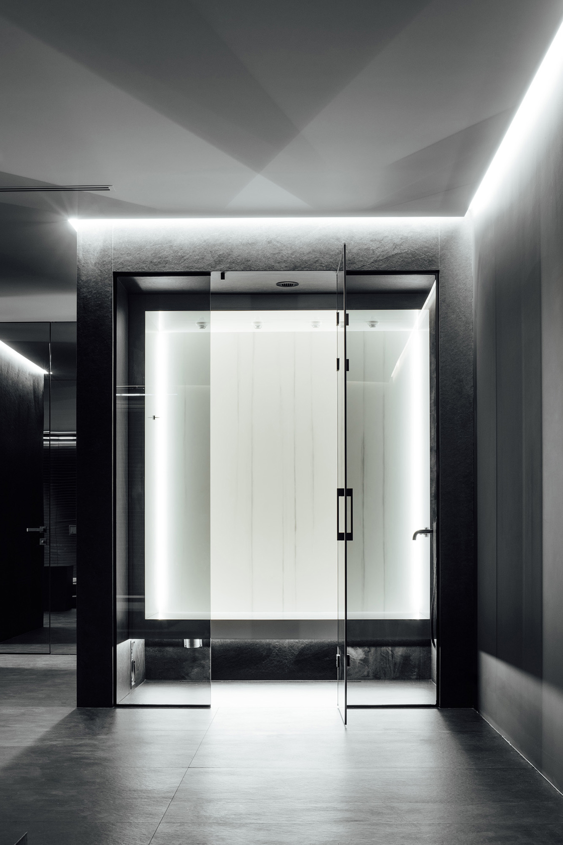 I materiali scelti per le finiture del bagno e dell’area Spa rispecchiano gli standard richiesti in termini di estetica, qualità e performance. Per i rivestimenti e per la pavimentazione sono state utilizzate le grandi lastre con formato 100x300 e 100x100 cm, sottili in gres porcellanato laminato della collezione Slimtech Waterfall che reinterpreta in modo realistico una pietra naturale e antica come l’ardesia. Proposta nella nuance antracite Dark Flow, la collezione ricopre le superfici degli ambienti, conferendo naturalità ed eleganza e creando un effetto grafico di grande impatto.