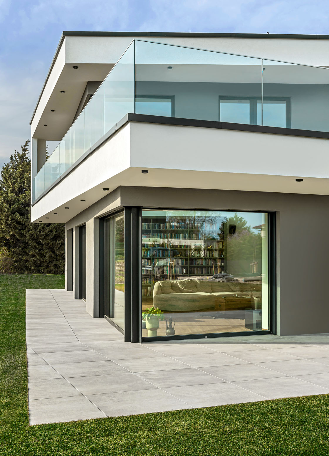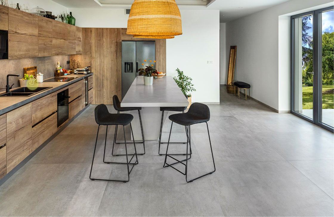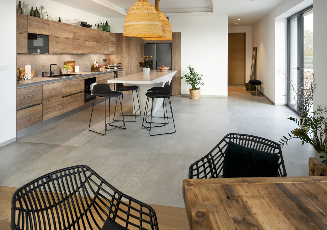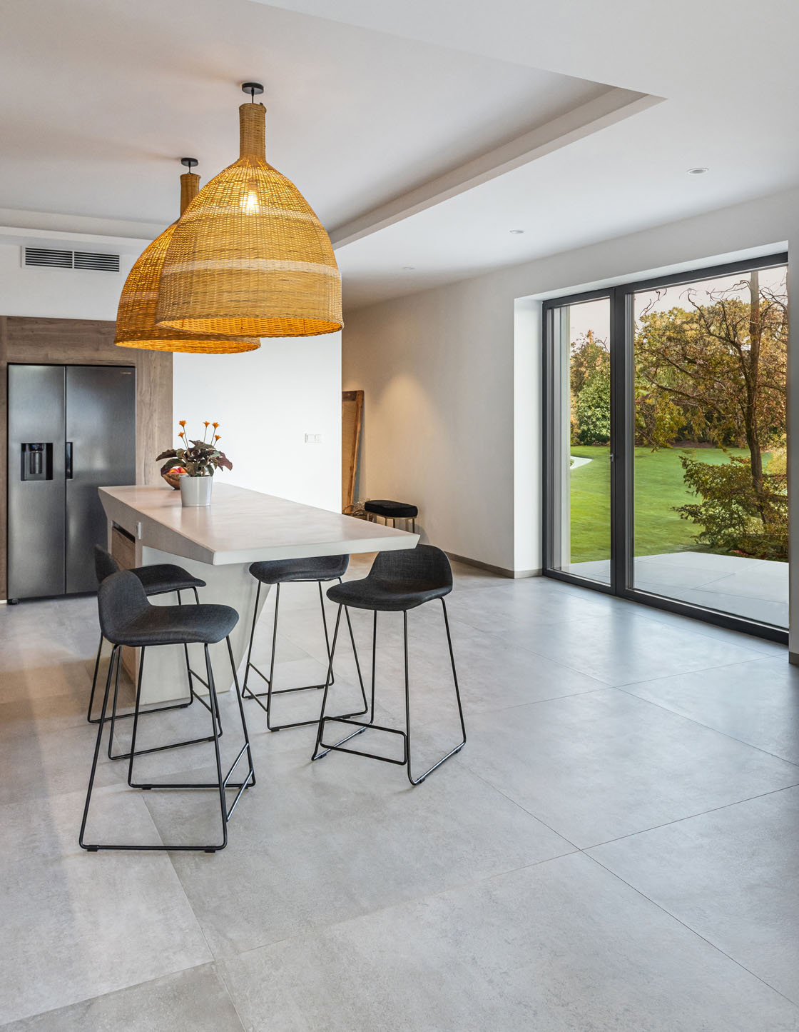 Tra i materiali scelti per la realizzazione della villa, lo studio di architettura ha optato anche per superfici in grés porcellanato grazie alla loro versatilità e alla possibilità di ricreare ambienti dallo stile elegante e dal gusto contemporaneo. Le scelte cromatiche completano e si fondono perfettamente con il progetto architettonico proponendo atmosfere calde, avvolgenti e rilassate. In particolare, per la collezione Concreto by Fabio Novembre è stata impiegata in più zone della casa per la sua capacità di plasmare il carattere di ogni ambiente: infatti, ispirata al cemento, materiale simbolo dell’architettura moderna, la collezione si articola su tre spessori, più finiture e più formati adatti a spazi intimi e privati, luoghi di lavoro o di rappresentanza, il soggiorno en plein air e la cucina. Proprio per il pavimento della grande cucina della villa sono state scelte lastre da 120x120 cm nel colore Light per creare un effetto luminoso, contemporaneo e a contrasto con il legno utilizzato per i mobili della cucina.