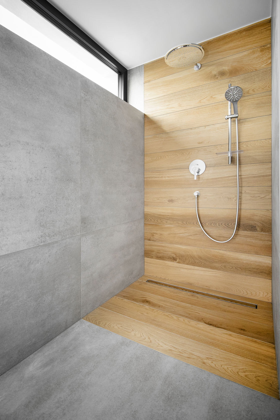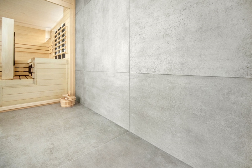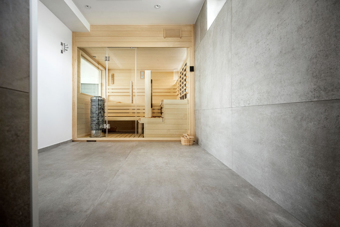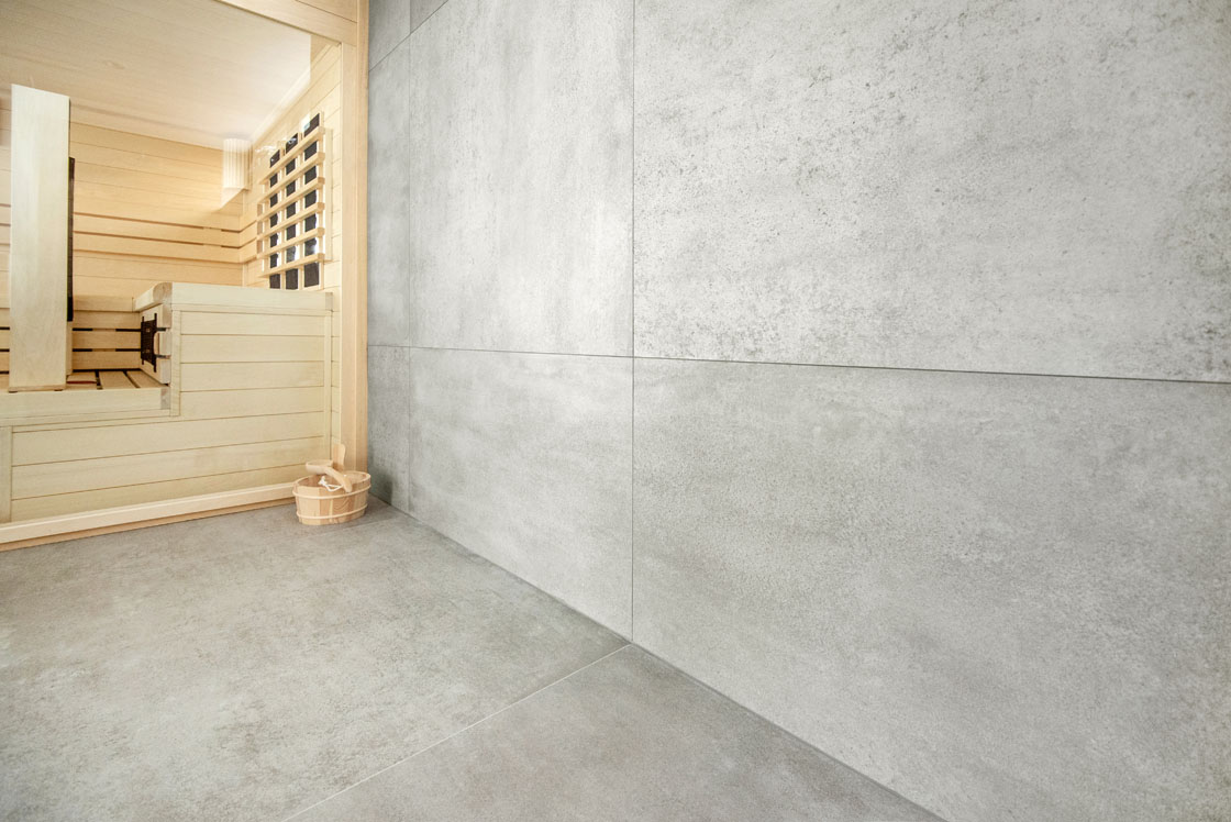 Concreto è stata impiegata anche per i bagni. In un primo bagno grandi lastre da 120x120 cm nella versione sottile Slimtech (6 mm) rivestono le pareti: la scelta di alternare la nuance Light al colore Rust permette di creare un elegante gioco cromatico che rimanda allo stile industriale. Mentre nel secondo bagno, l’ambiente è reso luminoso e rilassante attraverso le lastre Concreto Light questa volta accostate con la variante colore Medium.Per l’area della sauna, invece, i pavimenti in Concreto Light trovano il loro perfetto abbinamento con Bio Select nella colorazione Oak Natural in lastre dal formato 20x120 cm dello spessore di 9.5 mm, una proposta preziosa e una fedele interpretazione di essenze classiche, in colori contemporanei ed equilibrati.