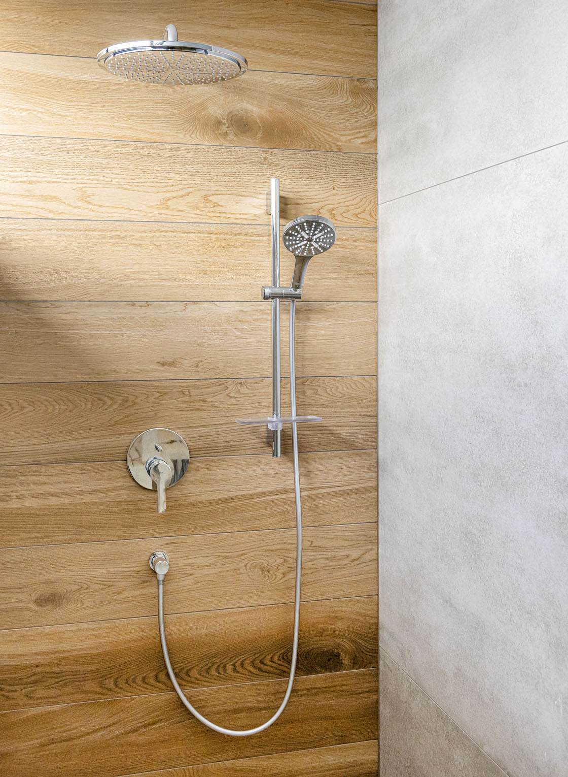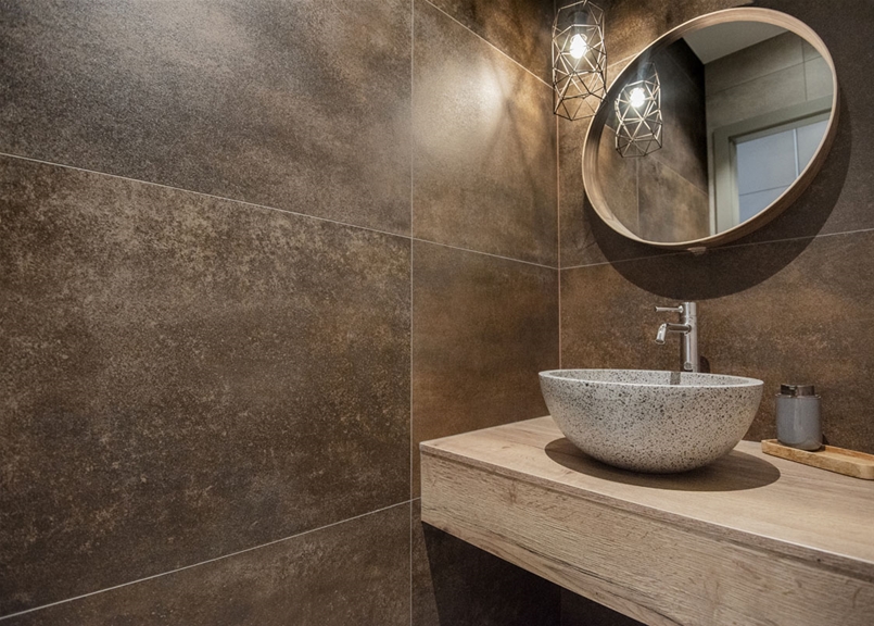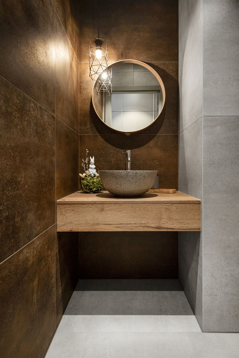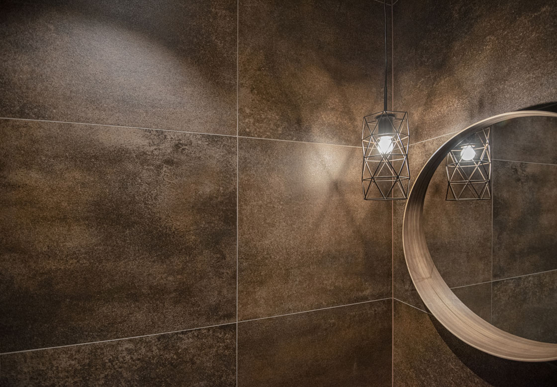 Concreto è stata impiegata anche per i bagni. In un primo bagno grandi lastre da 120x120 cm nella versione sottile Slimtech (6 mm) rivestono le pareti: la scelta di alternare la nuance Light al colore Rust permette di creare un elegante gioco cromatico che rimanda allo stile industriale. Mentre nel secondo bagno, l’ambiente è reso luminoso e rilassante attraverso le lastre Concreto Light questa volta accostate con la variante colore Medium.Per l’area della sauna, invece, i pavimenti in Concreto Light trovano il loro perfetto abbinamento con Bio Select nella colorazione Oak Natural in lastre dal formato 20x120 cm dello spessore di 9.5 mm, una proposta preziosa e una fedele interpretazione di essenze classiche, in colori contemporanei ed equilibrati.