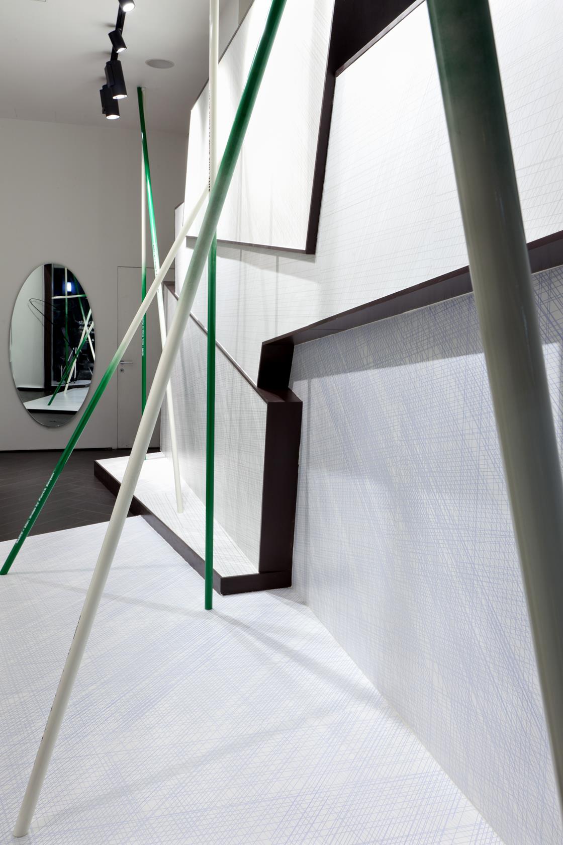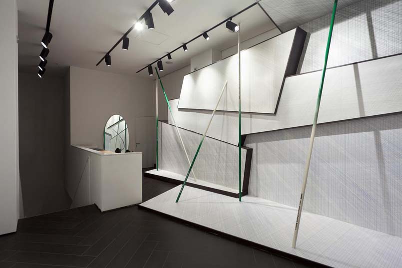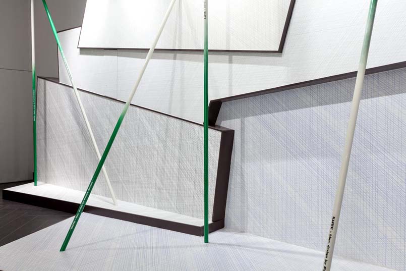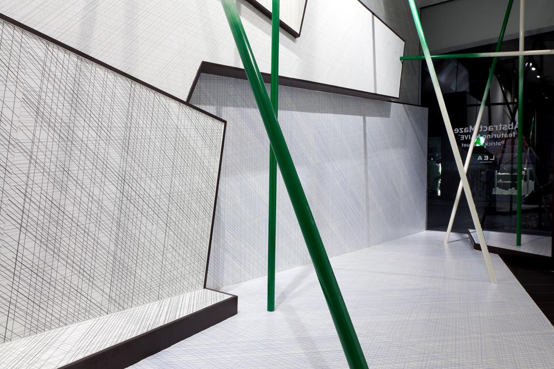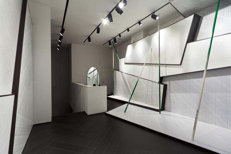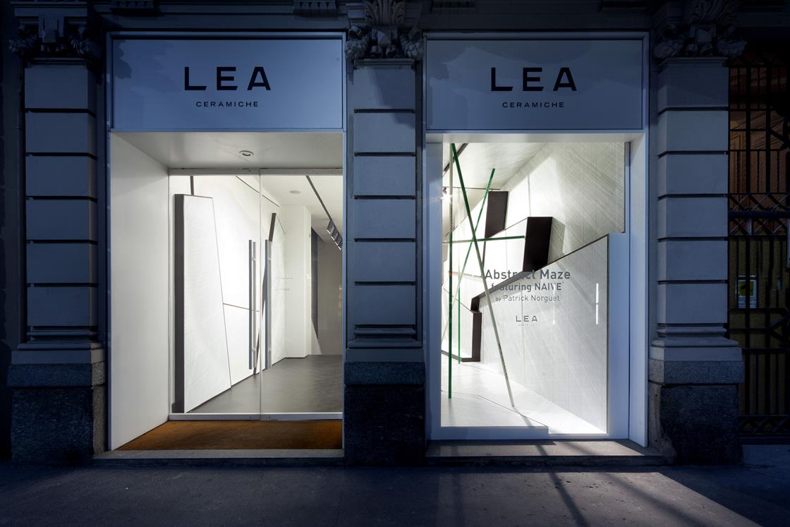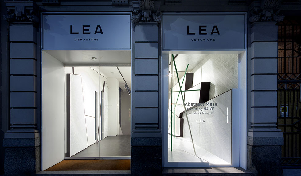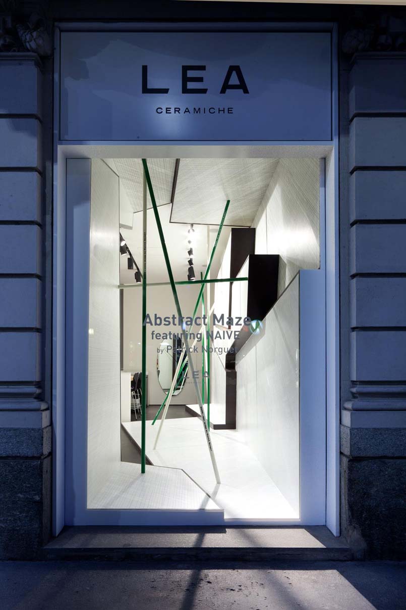 L’allestimento, pensato da Patrick Norguet per lo spazio Lea Ceramiche di via Durini Milano, mette in risalto Naive nella sua varietà cromatica e nella sua integrazione con lo spazio architettonico. Le imponenti lastre, tagliate in forme irregolari e posate in differenti livelli di orientamento e altezza, creano nuovi confini spaziali. Tubi metallici si estendono dal soffitto al pavimento, un intreccio di linee colorate che rimanda al pattern del progetto e che ricrea un nuovo paesaggio architettonico.