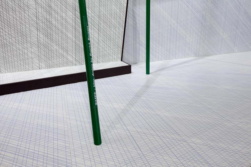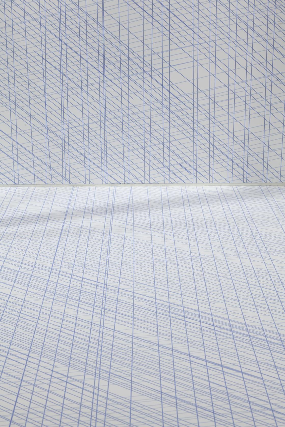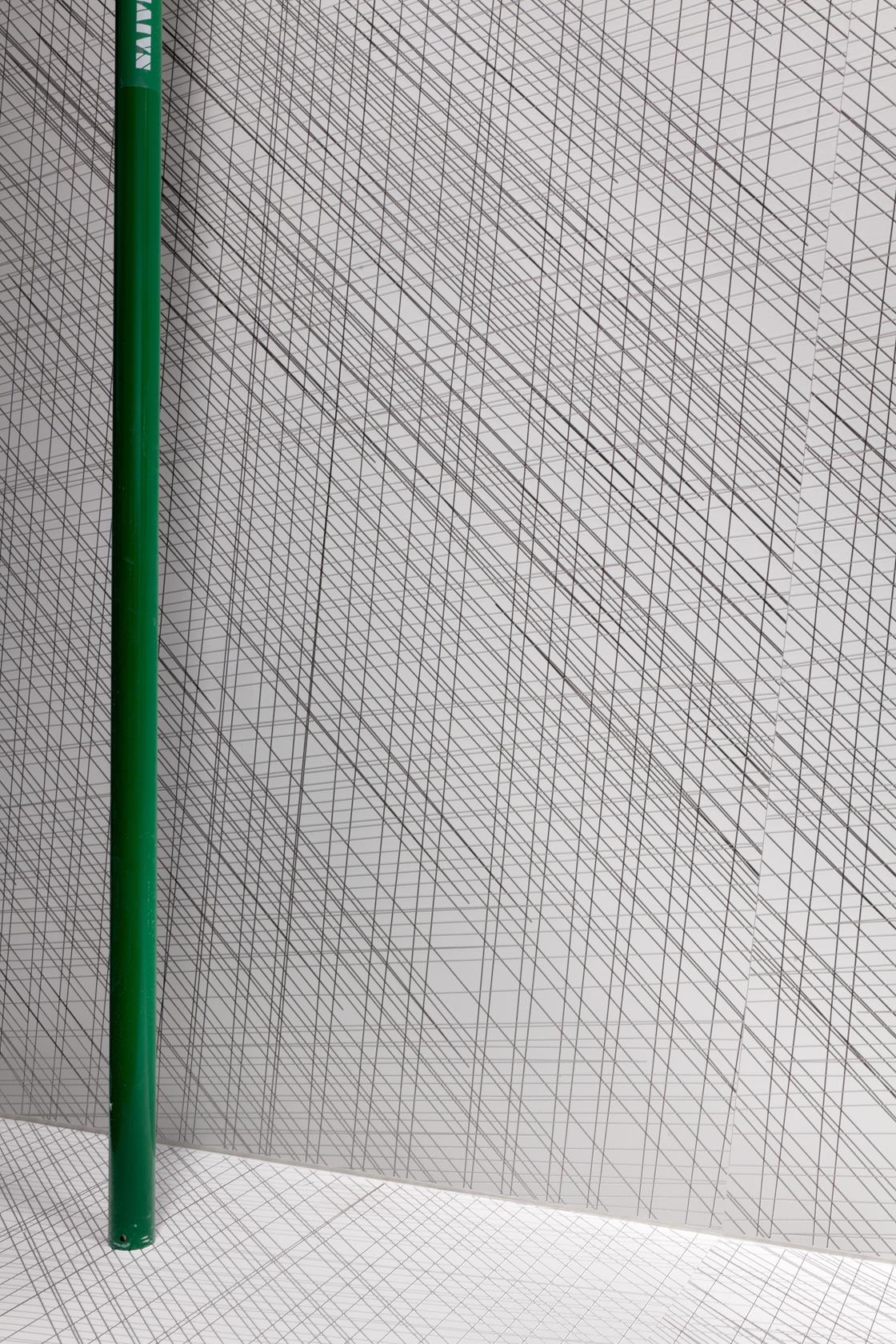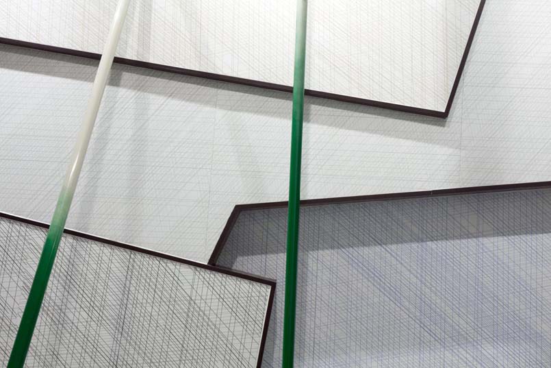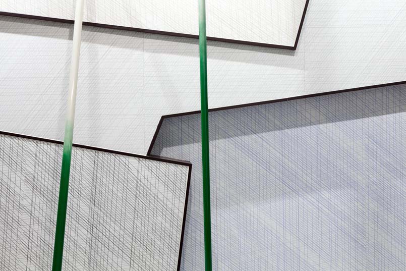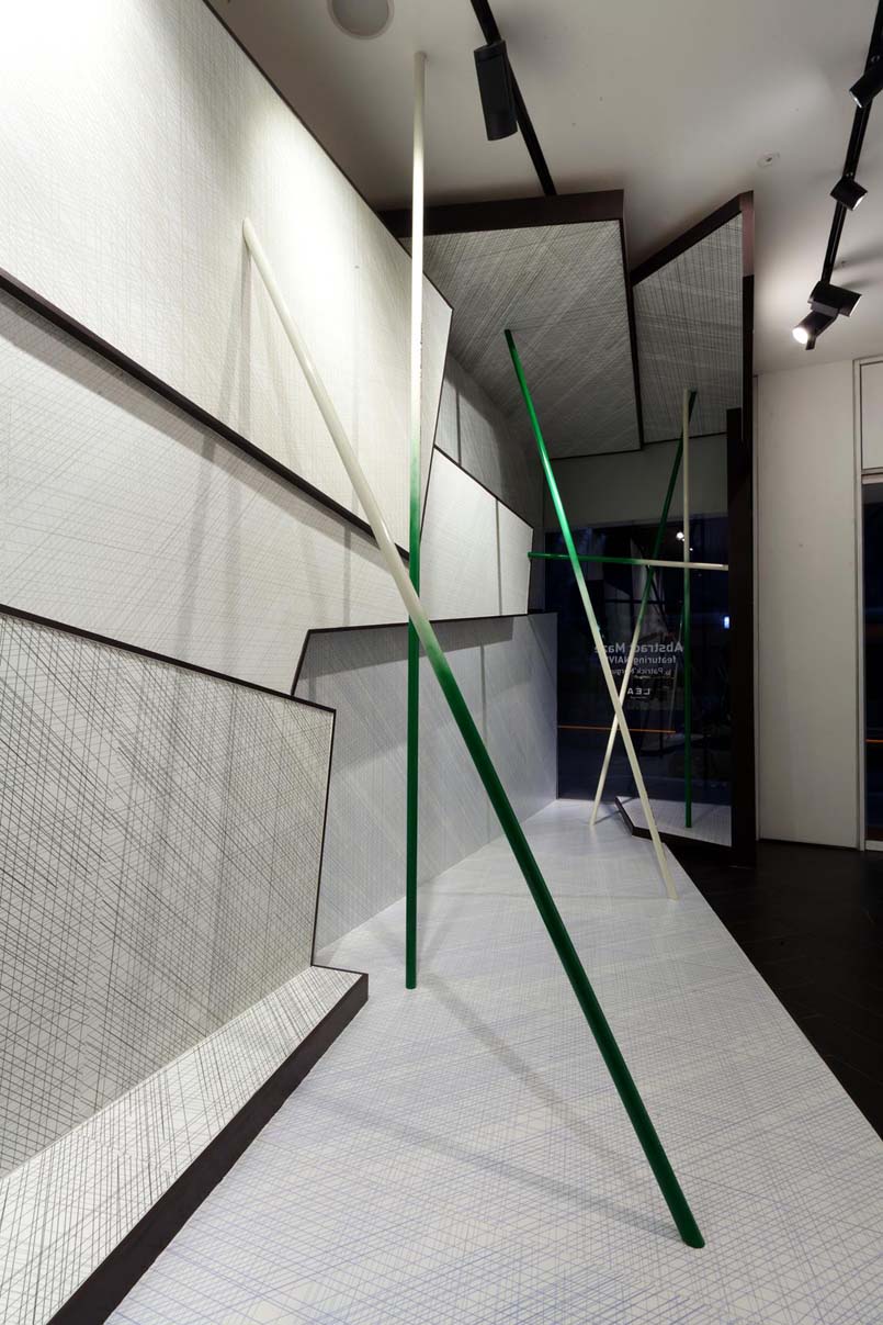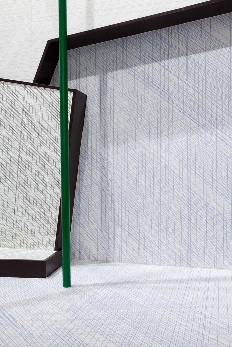 L’allestimento, pensato da Patrick Norguet per lo spazio Lea Ceramiche di via Durini Milano, mette in risalto Naive nella sua varietà cromatica e nella sua integrazione con lo spazio architettonico. Le imponenti lastre, tagliate in forme irregolari e posate in differenti livelli di orientamento e altezza, creano nuovi confini spaziali. Tubi metallici si estendono dal soffitto al pavimento, un intreccio di linee colorate che rimanda al pattern del progetto e che ricrea un nuovo paesaggio architettonico.