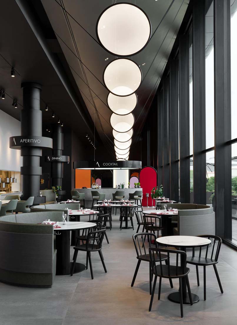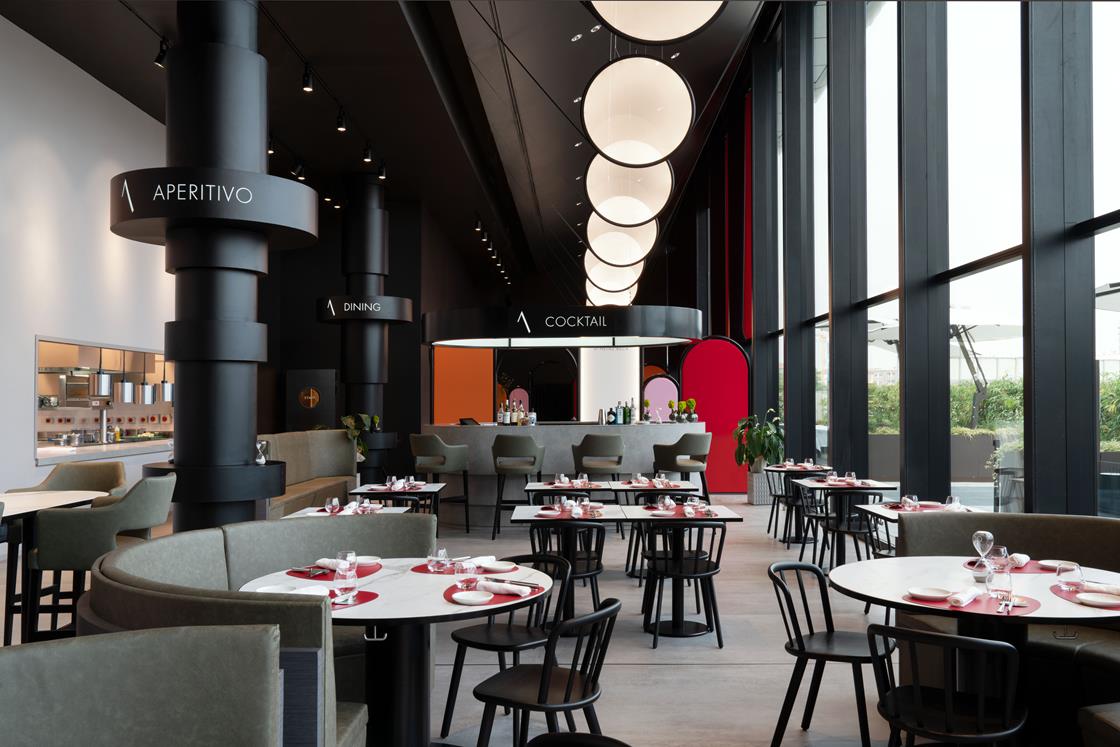 L’Arch. Fabio Novembre firma il progetto e sceglie i prodotti di Lea Ceramiche per rivestire l’intera superficie dello spazio. In particolare è stata utilizzata la collezione Slimtech Concreto, serie firmata dallo stesso Fabio Novembre e che reinterpreta il cemento in chiave moderna. Le grandi lastre sottili, in questo caso declinate nello spessore di 6mm e nei grandi formati, fino a 120x260cm, fanno da sfondo all’elegante scenografia degli arredi. L’intensa tonalità Dark scandisce le aree dedicate all’aperitivo, al bistrot e al fine dining, conferendo all’intero spazio uno stile raffinato ma informale, dedicato a chi intende vivere un’esperienza enogastronomica unica in un arco di tempo limitato.