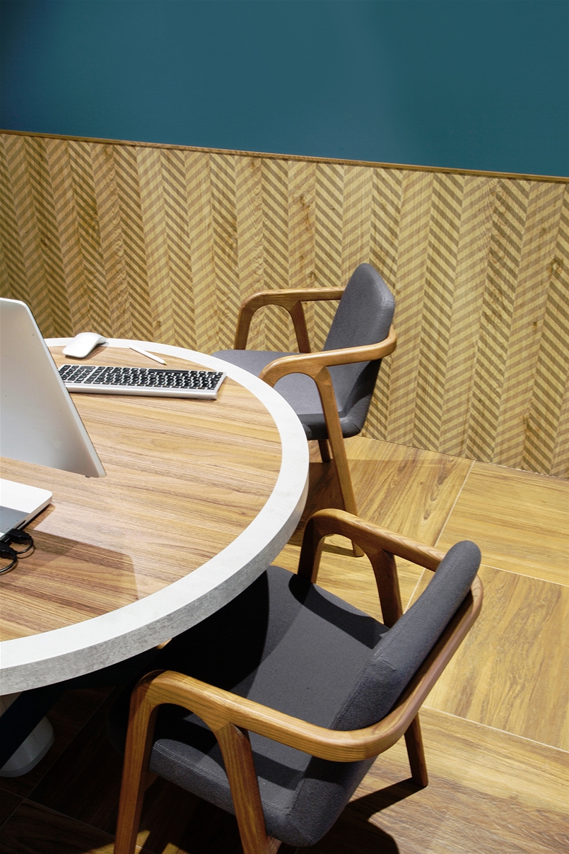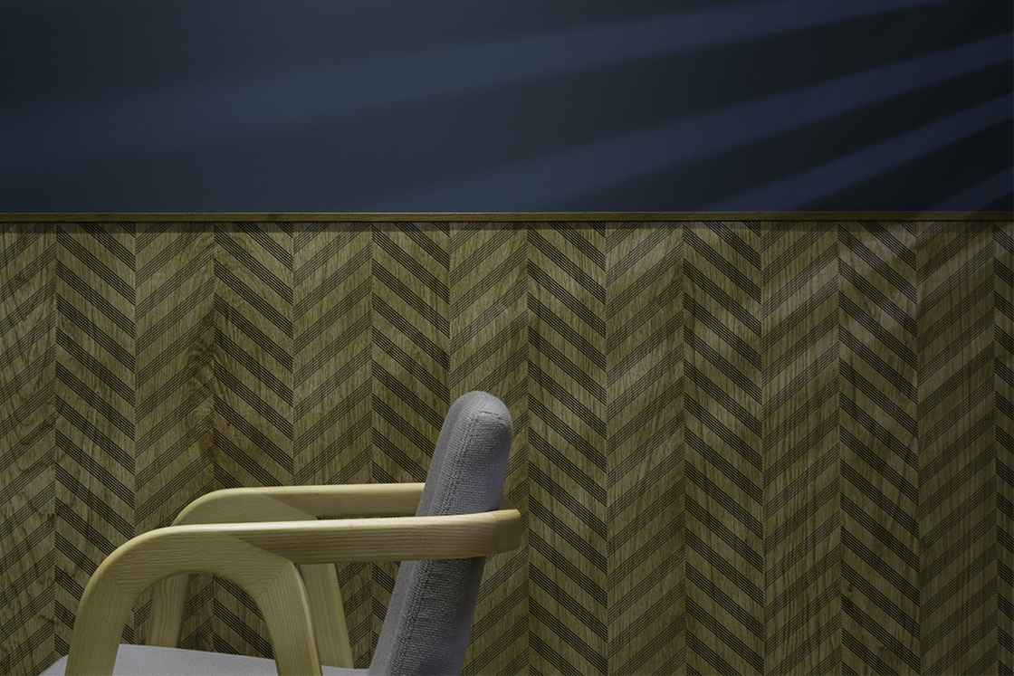 Nell’ambito di questo nuovo concept di filiale, si colloca la scelta di DINN! di inserire all’interno del progetto Type 32 Slimtech di Lea Ceramiche. Le lastre dal formato personalizzato Slimtech (20x100cm), in gres laminato sottile (5,5mm di spessore), sono caratterizzate dalla sovrapposizione di due layer. Il primo, più materico, costituito da una serigrafia che gioca con il tema della verosimiglianza, riproduce un’essenza. Il secondo, più grafico, consiste in un decoro, basato sulla reiterazione della linea obliqua, declinato in quattro pattern.
