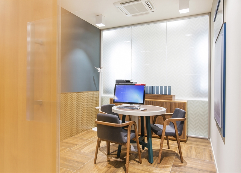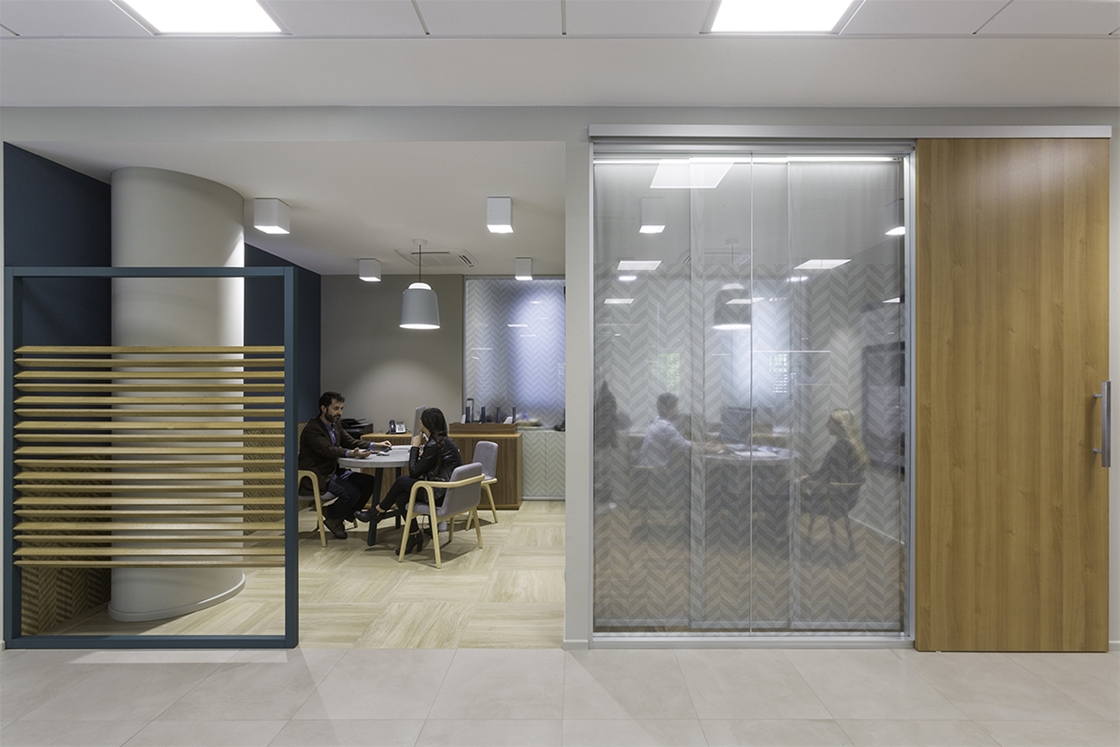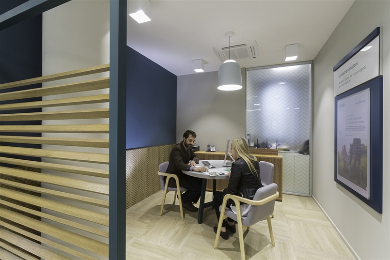 Type 32, utilizzato sulla parete dell’ingresso della banca o come boiserie nelle aree di accoglienza e consulenza dei clienti, sottolinea e riassume il nuovo stile del brand BPER Banca. Un luogo di relazione, confortevole e accogliente, reso ancora più aperto grazie alla semplificazione di gran parte delle barriere fisiche: le pareti divisorie trasparenti rimandano al disegno grafico di Type, un decoro che si ripete nei diversi ambienti come segno distintivo dell’intero progetto.