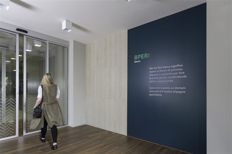 “La scelta di Type 32 è stata dettata dalla ricerca di un materiale tecnico di forte impatto estetico, elegante e moderno allo stesso tempo. Un cliente dalla forte storicità come BPER, ma decisamente proiettato nel futuro, necessitava di un segno grafico con questo compromesso: una soluzione ponte tra un linguaggio contemporaneo e l’eco di uno stile classico. Un segno decorativo evidente che si sposa benissimo con il contesto, accogliente e innovativo.”