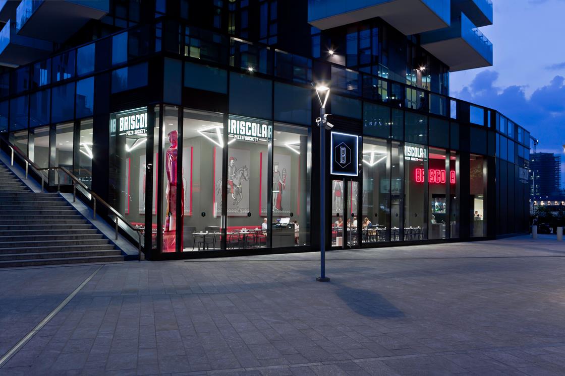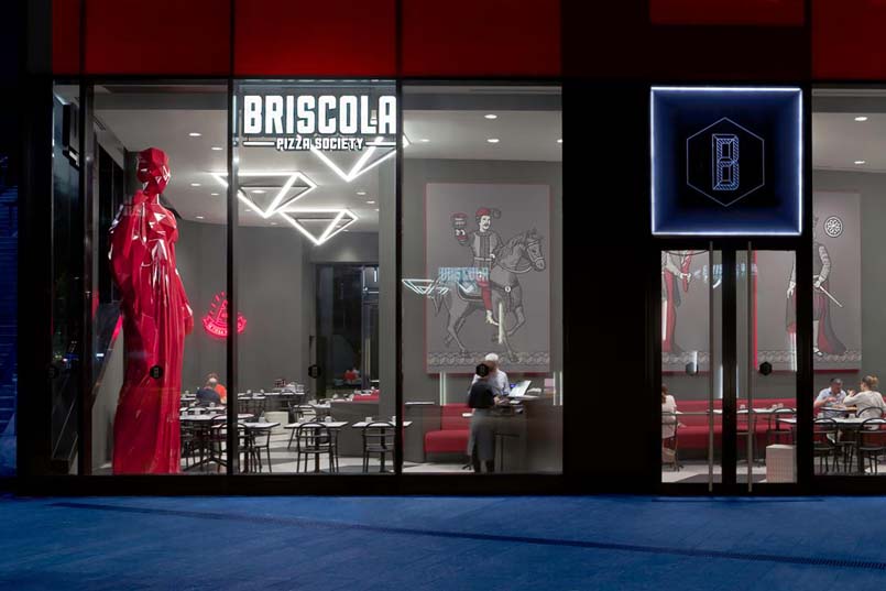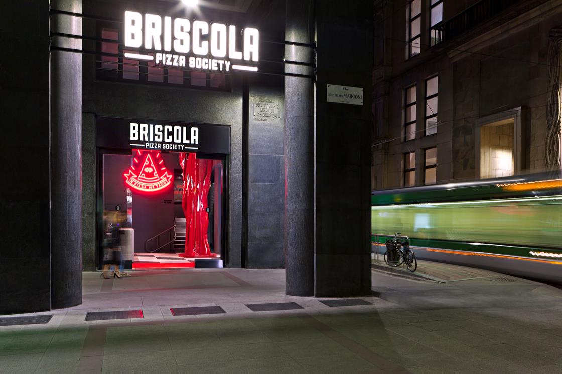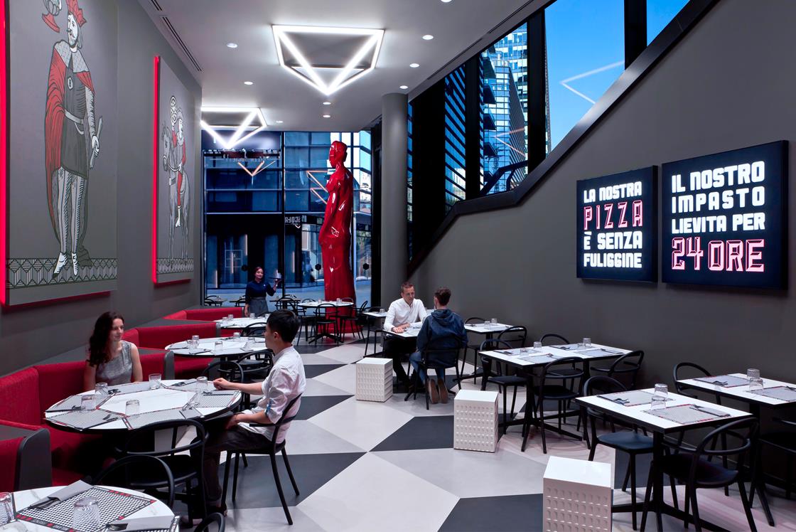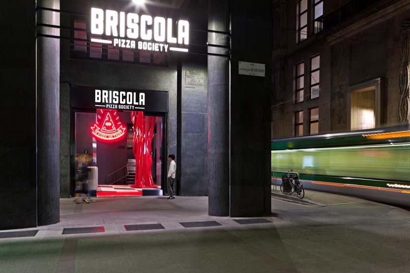 Una sequenza dinamica di moduli romboidali a pavimento firmati da Lea Ceramiche contraddistingue gli spazi milanesi di Briscola Pizza Society.