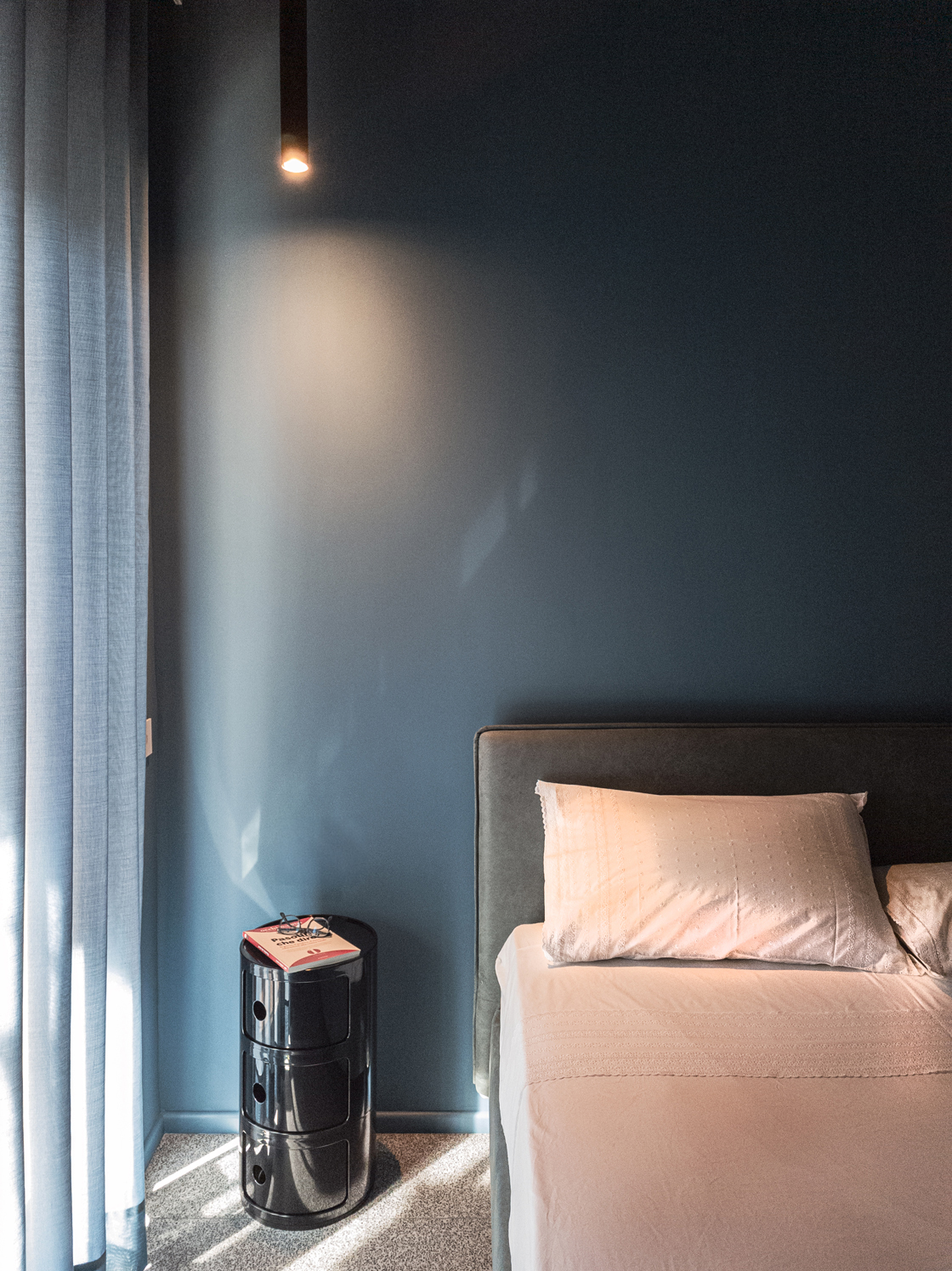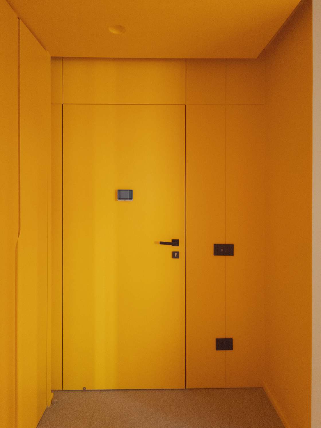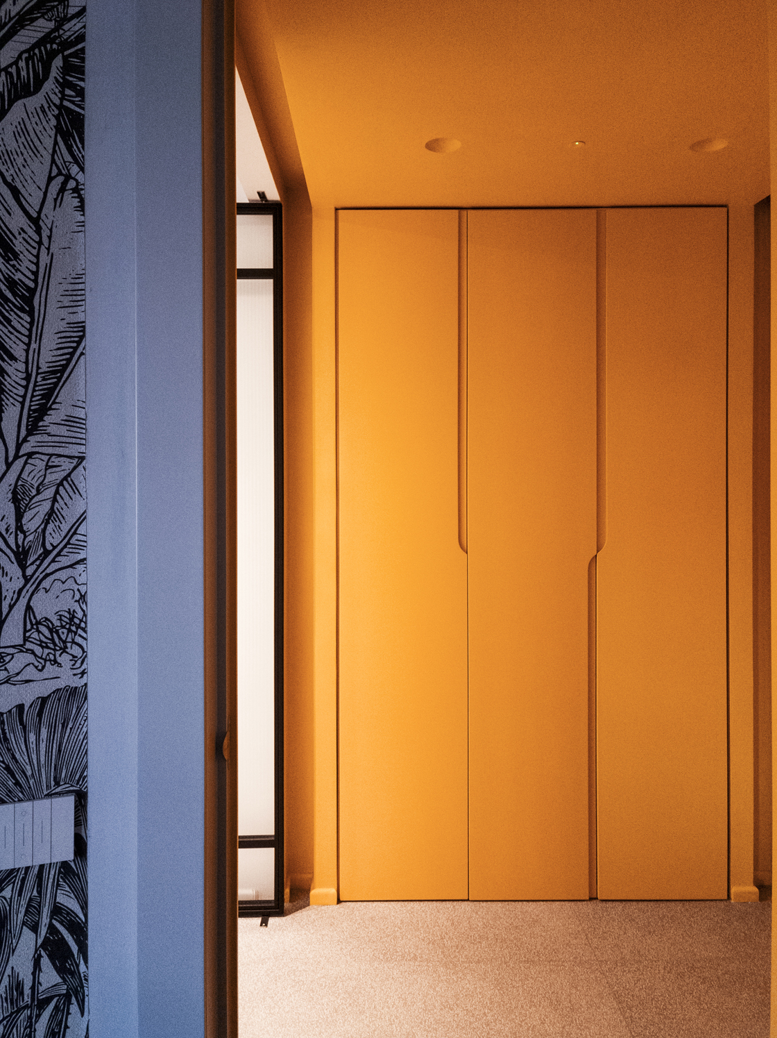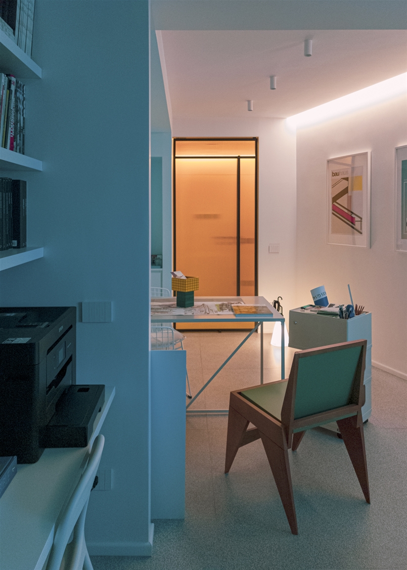 L’abitazione è stata oggetto di un vero “progetto del colore”, che, grazie a codici precisi e all’uso di gradienti, ha coinvolto ogni elemento, creando un effetto “scatola” avvolgente e d’impatto.