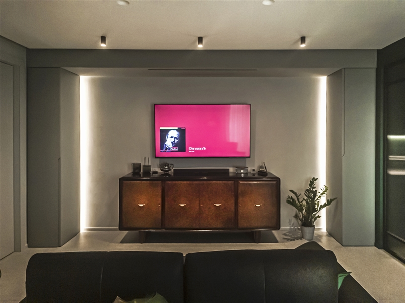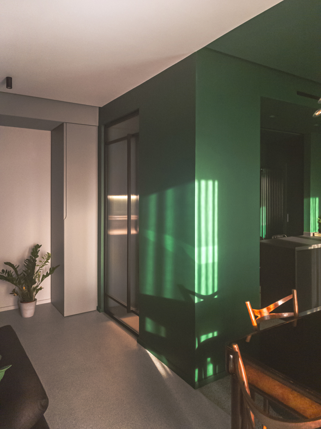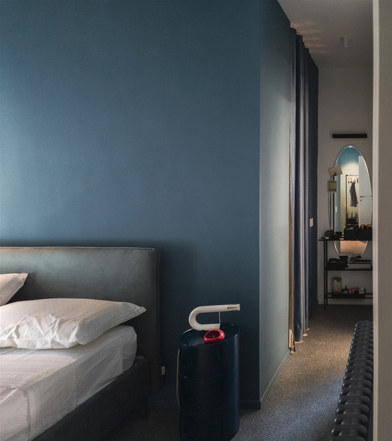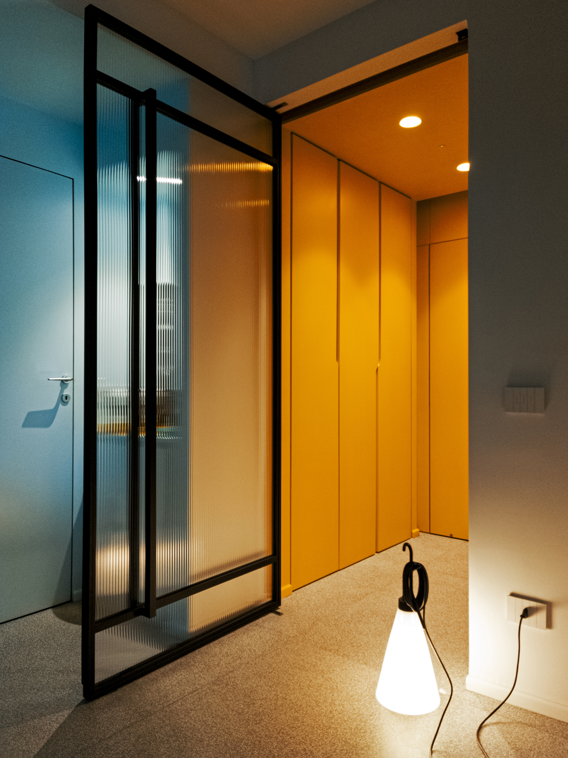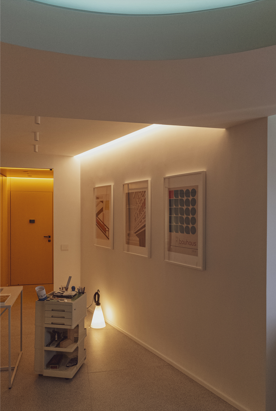 L’abitazione è stata oggetto di un vero “progetto del colore”, che, grazie a codici precisi e all’uso di gradienti, ha coinvolto ogni elemento, creando un effetto “scatola” avvolgente e d’impatto.
