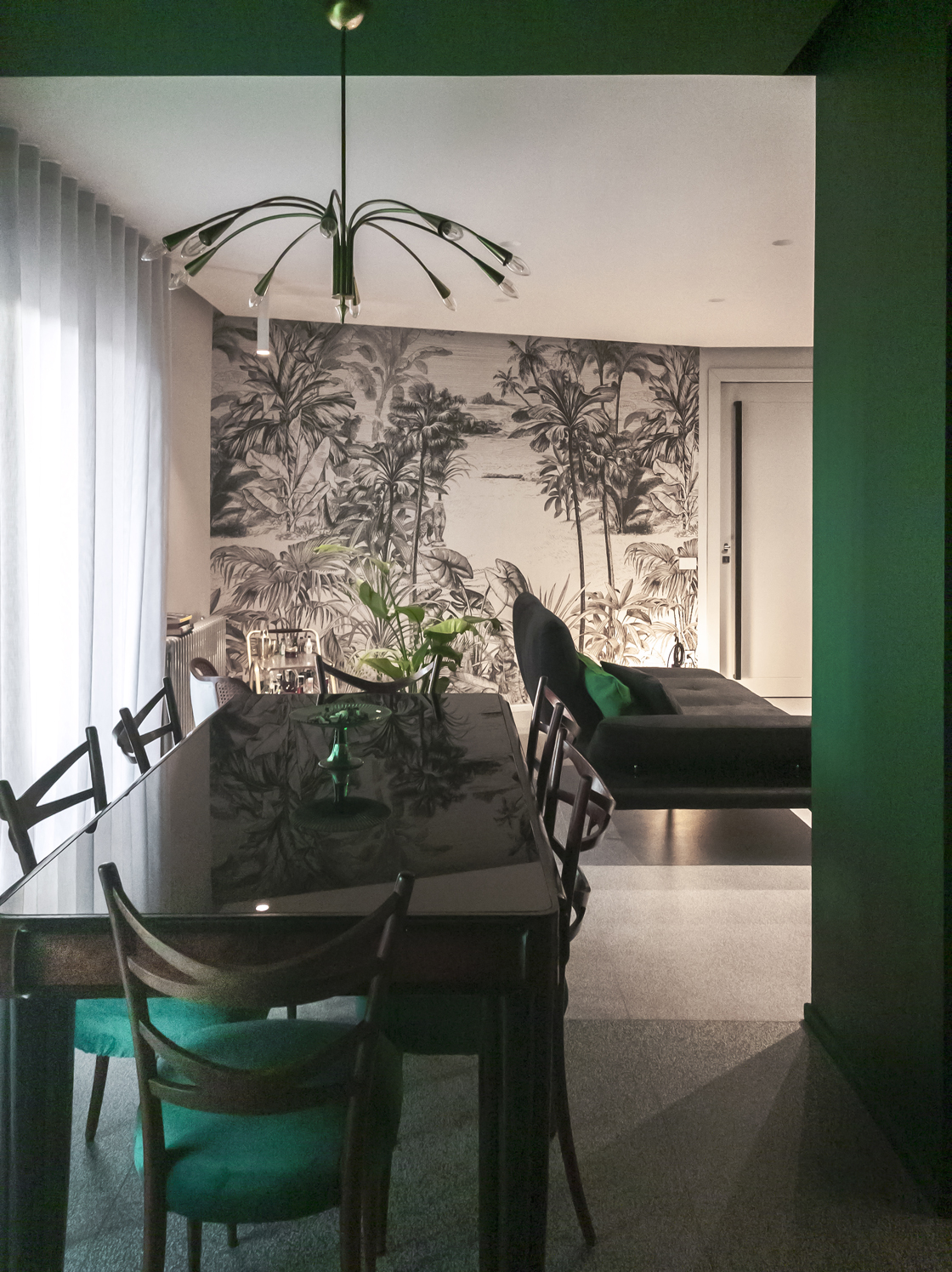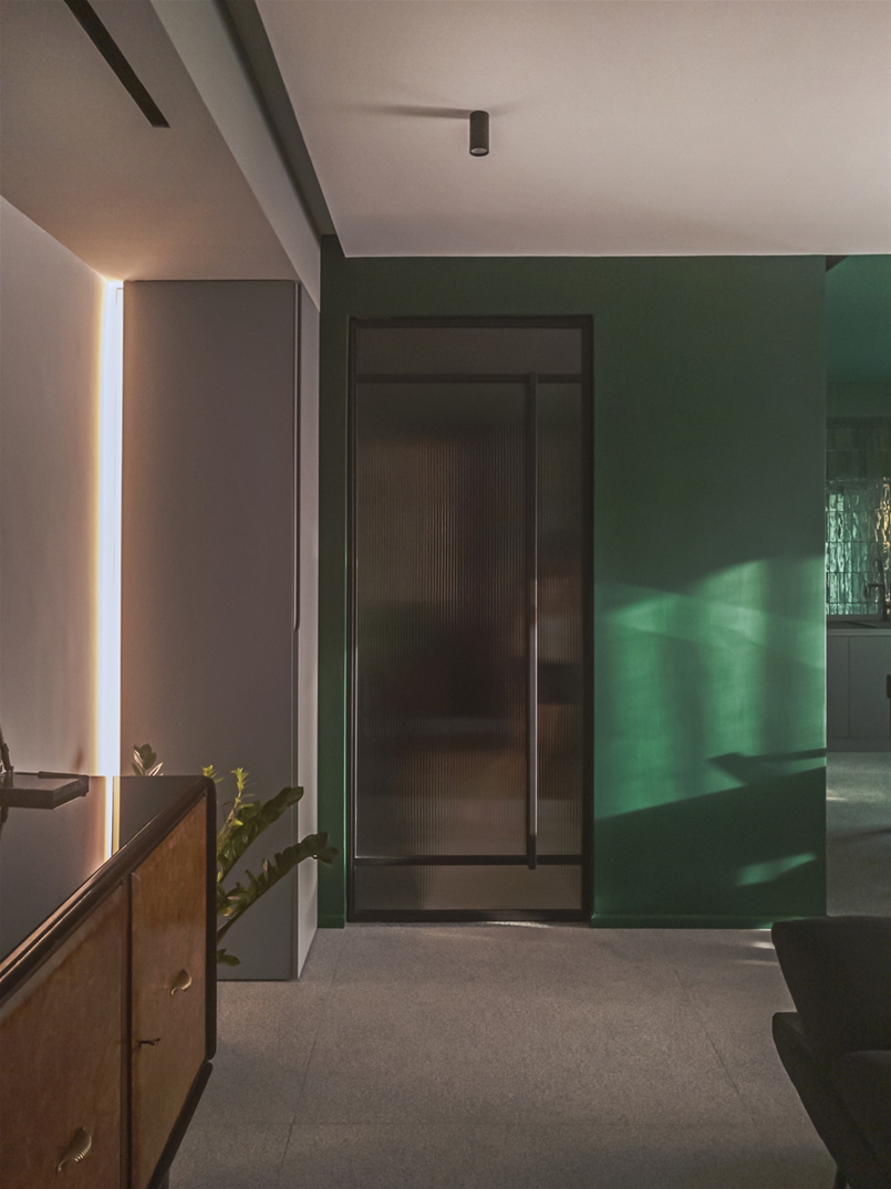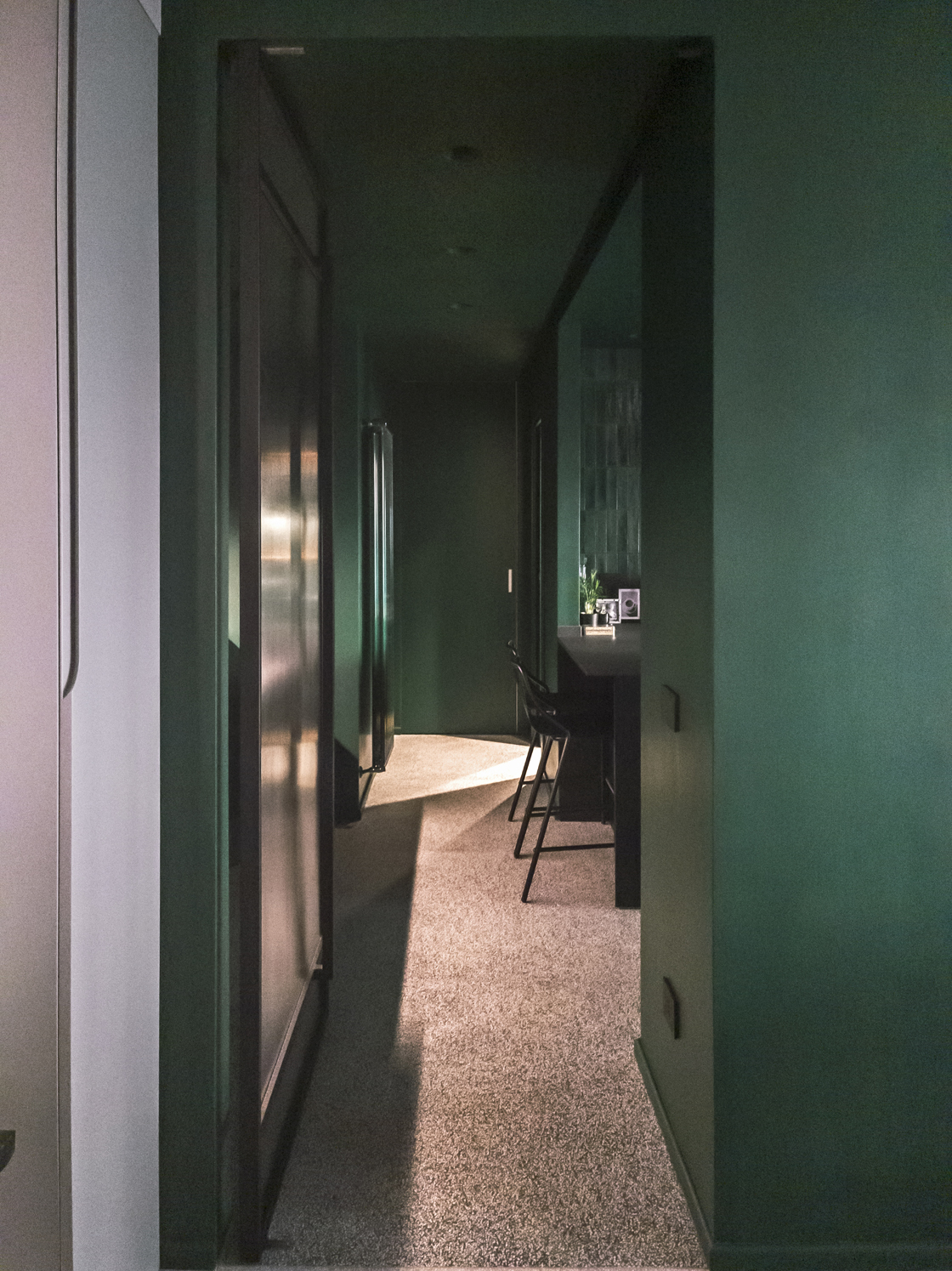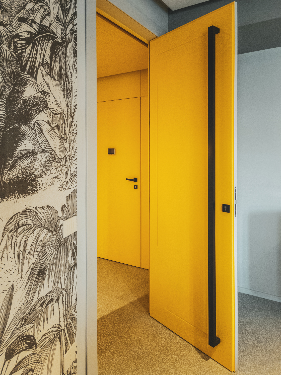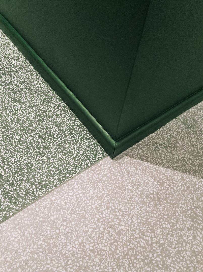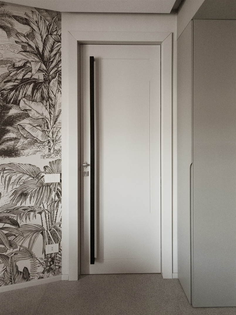La raffinatezza luminosa di Piece Light impreziosisce lo studio e la zona living, mentre il verde intenso e naturale di Piece Alpi dona eleganza alla cucina, creando un’atmosfera accogliente. Per la zona notte è stata scelta la sofisticata profondità di Piece Dark, capace di rendere intimo e rilassante qualsiasi ambiente; mentre Master Coal, selezionato per una superficie di circa 20 mq, si distingue per il suo tono deciso e profondo, conferendo un tocco di classe all’intero progetto.