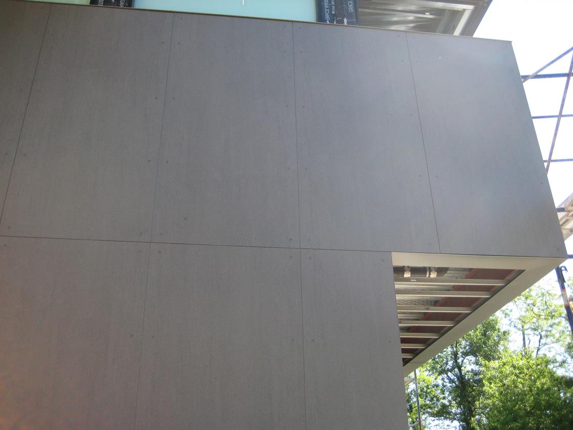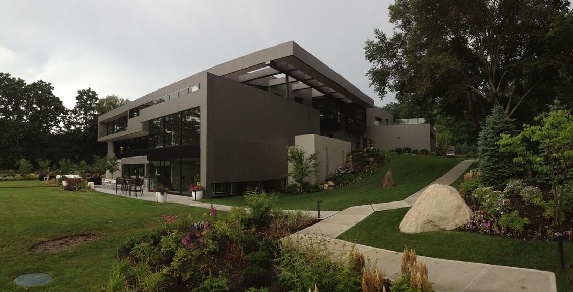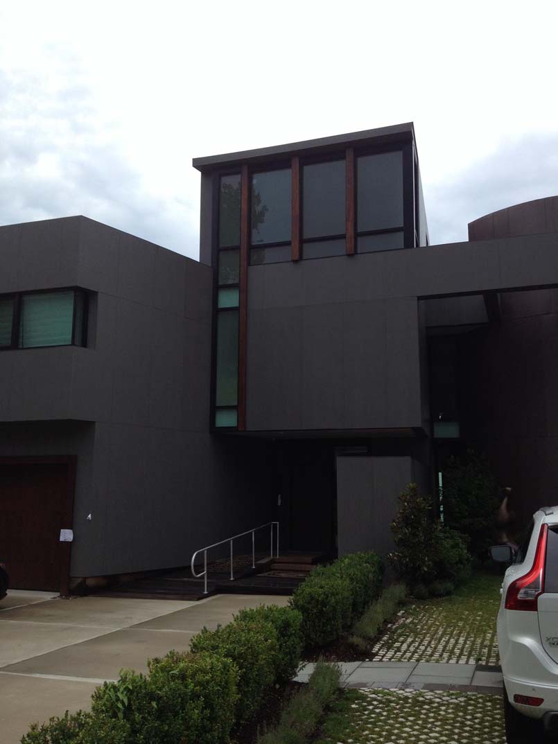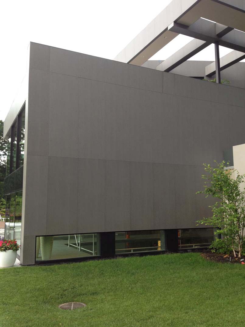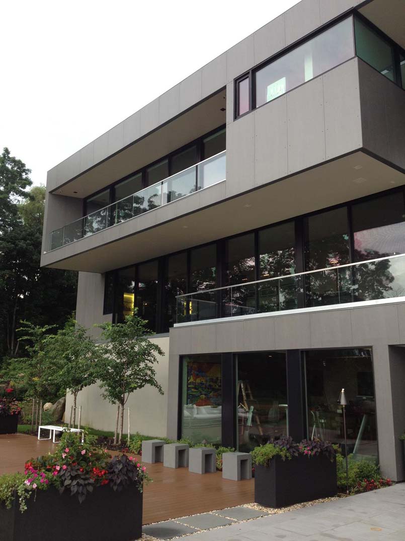 Forme sculturali e i materiali, senza ammiccamenti estetici e legati alla tradizione culturale dei proprietari che sono di origine indiana, sono tecnologici, distinti ma in armonia: legno d’acero, pannelli di alluminio, vetro e acciaio ma protagonista indiscussa di Chabra Residence è la ceramica.