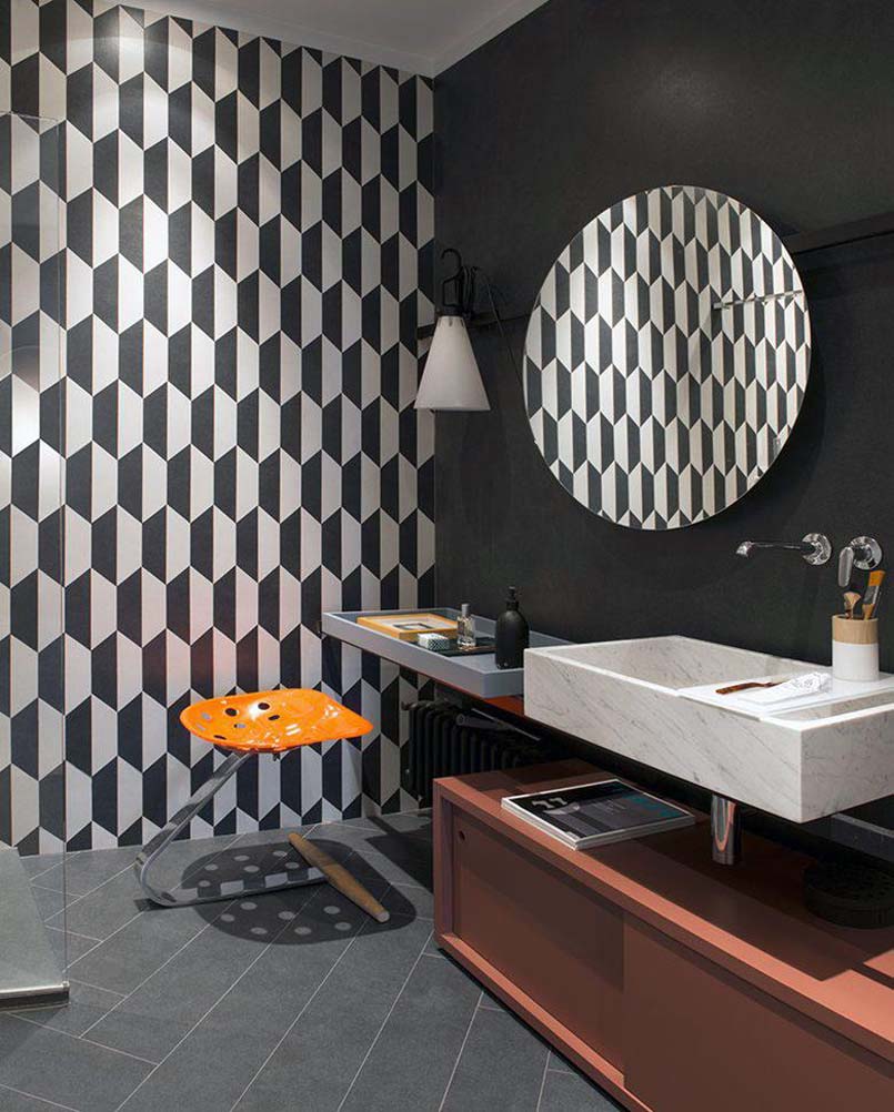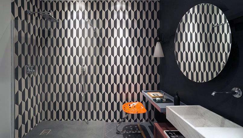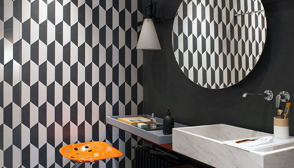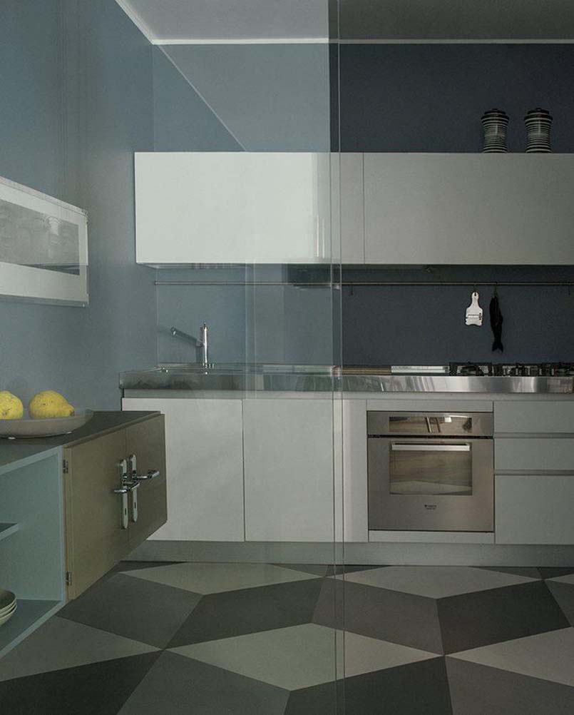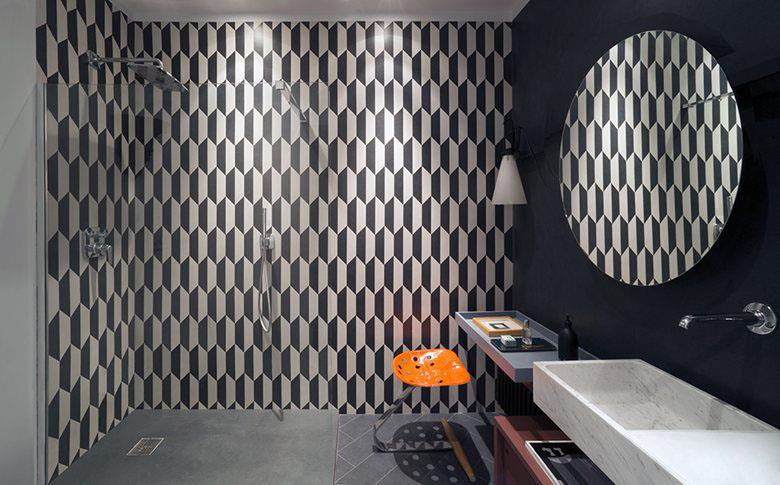 Le superfici di stampo escheriano della cucina e del bagno, realizzate con le collezioni in gres porcellanato laminato Slimtech di Lea Ceramiche, giocano con lo spazio e creano un effetto di straniamento grazie a colori pieni e geometrie ritmate.