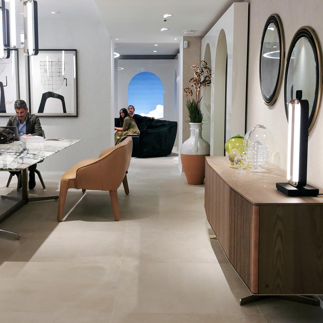 La “piazza” accoglie anche una lounge multifunzione per gli incontri con i clienti e per l’esperienza virtuale in 3D; diversi ambienti, collegati tra loro si diramano dall’area centrale dando origine a quattro spazi dedicati alla zona living e tre alle proposte di total living.