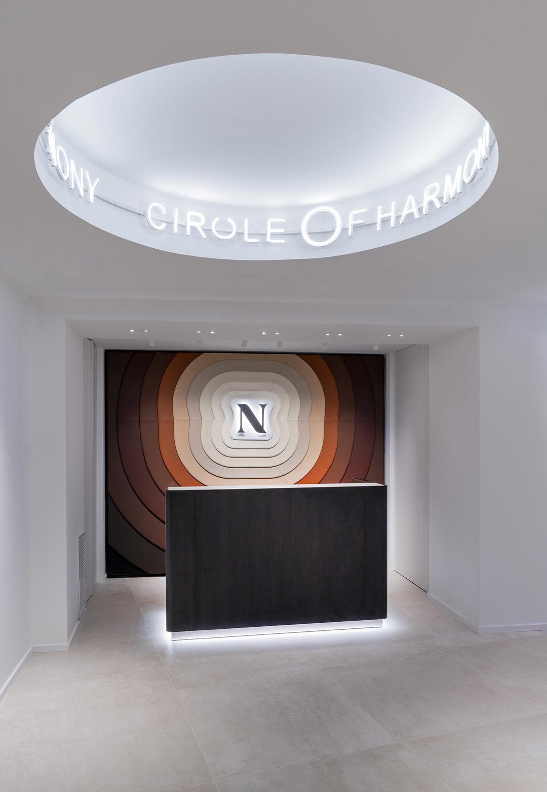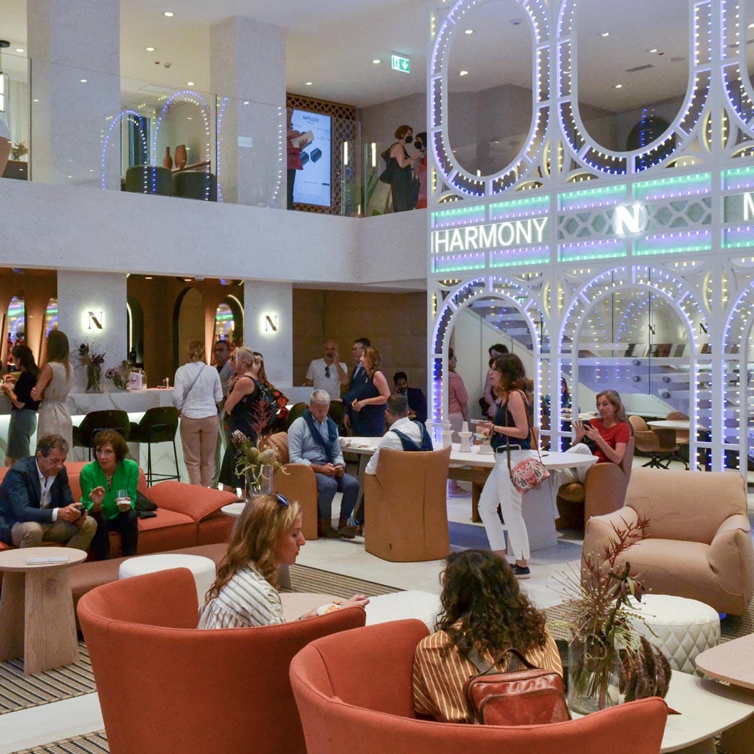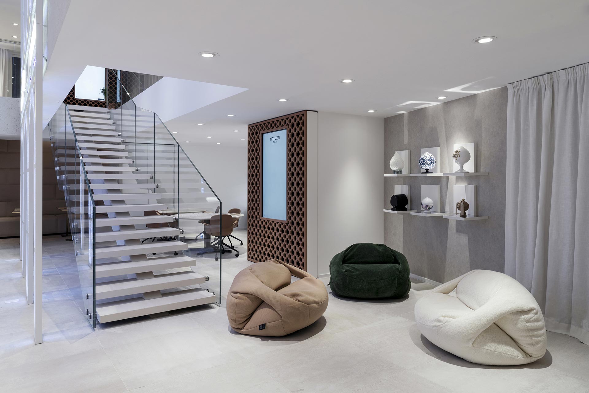 Fulcro del progetto è la grande hall a doppia altezza animata dalle luminarie tipiche delle feste di piazza della tradizione pugliese: luogo della socialità e delle relazioni, lo spazio diventa una galleria ideale per presentare le nuove collezioni insieme ai best seller e ai pezzi più iconici di Natuzzi.