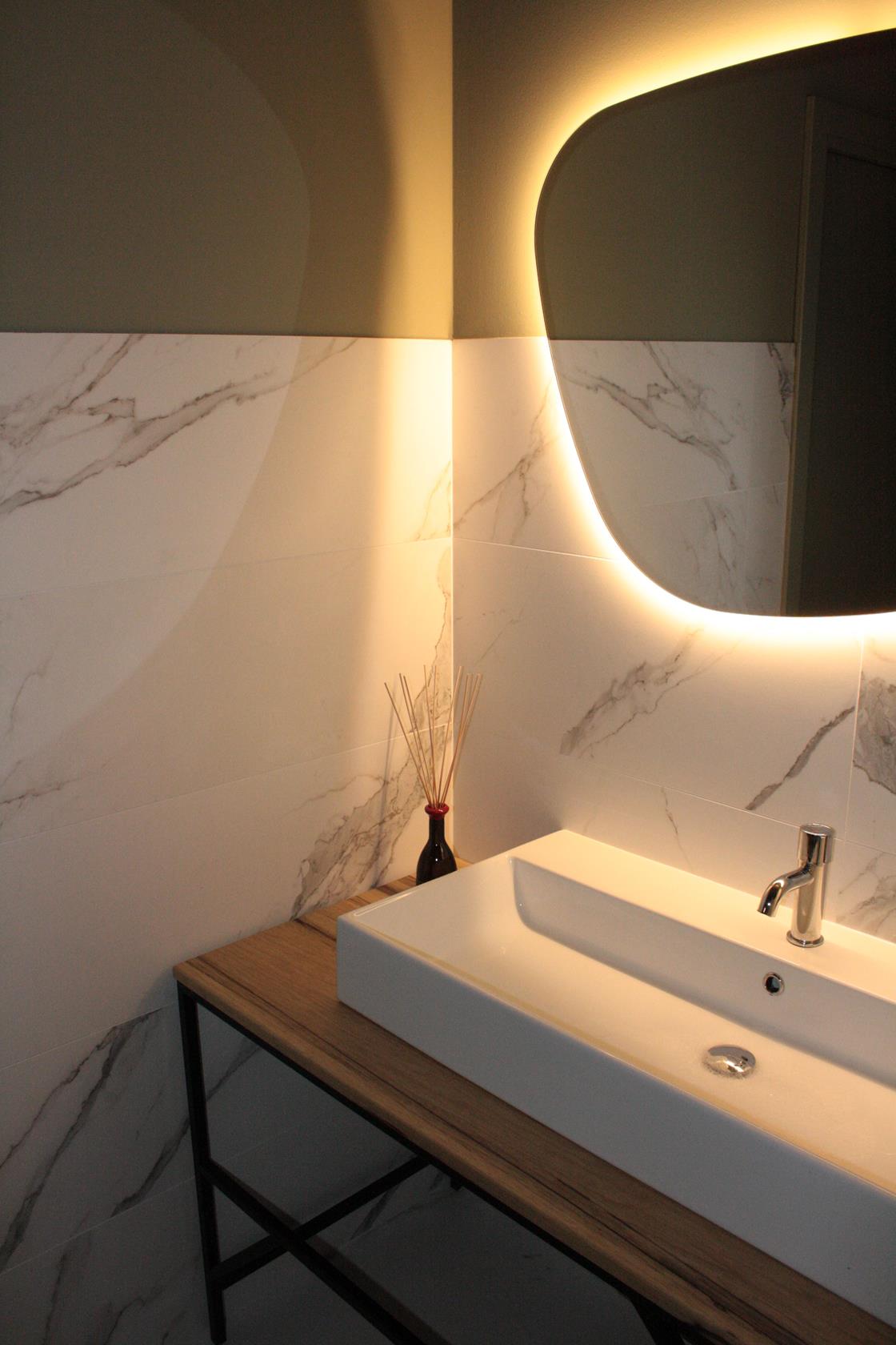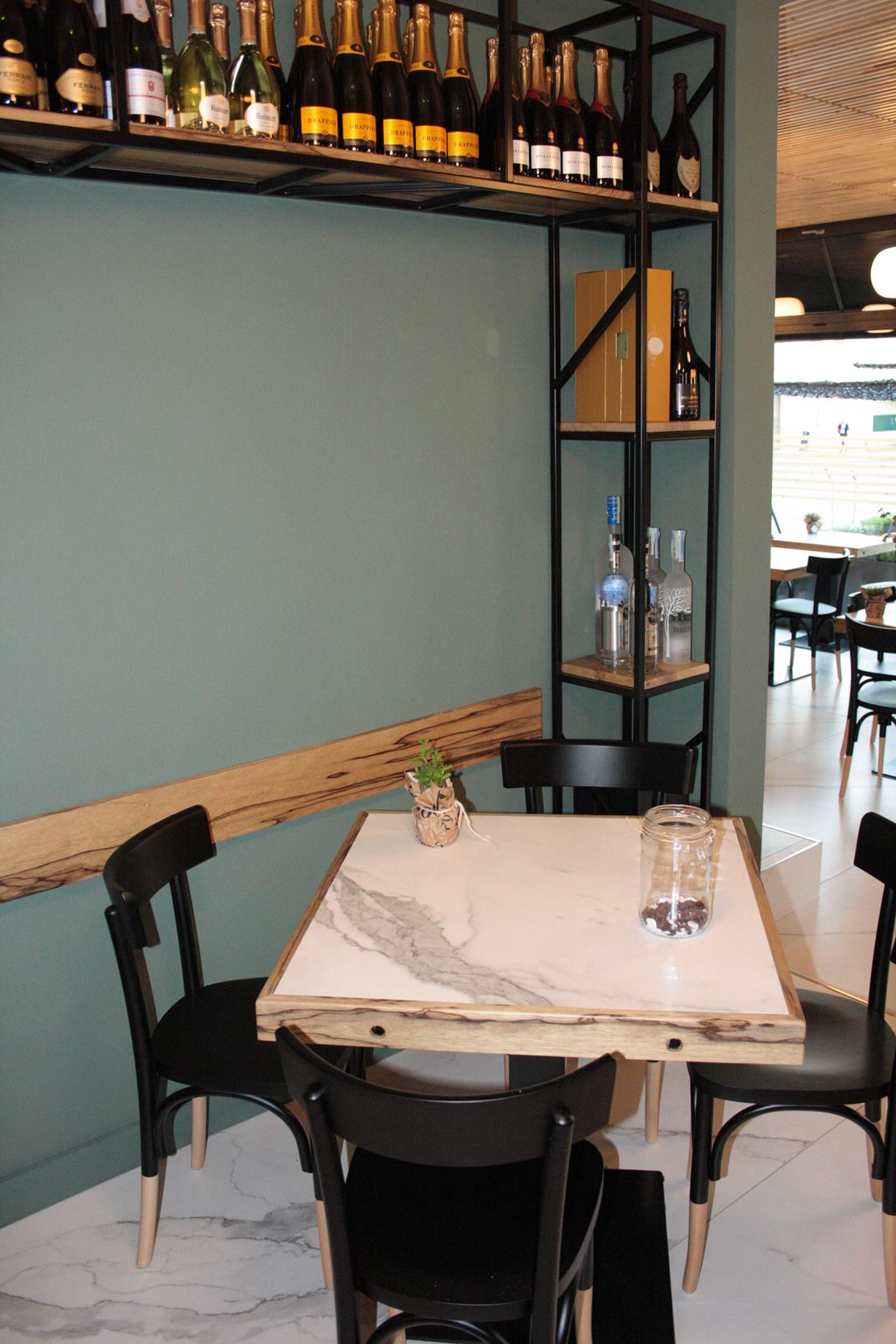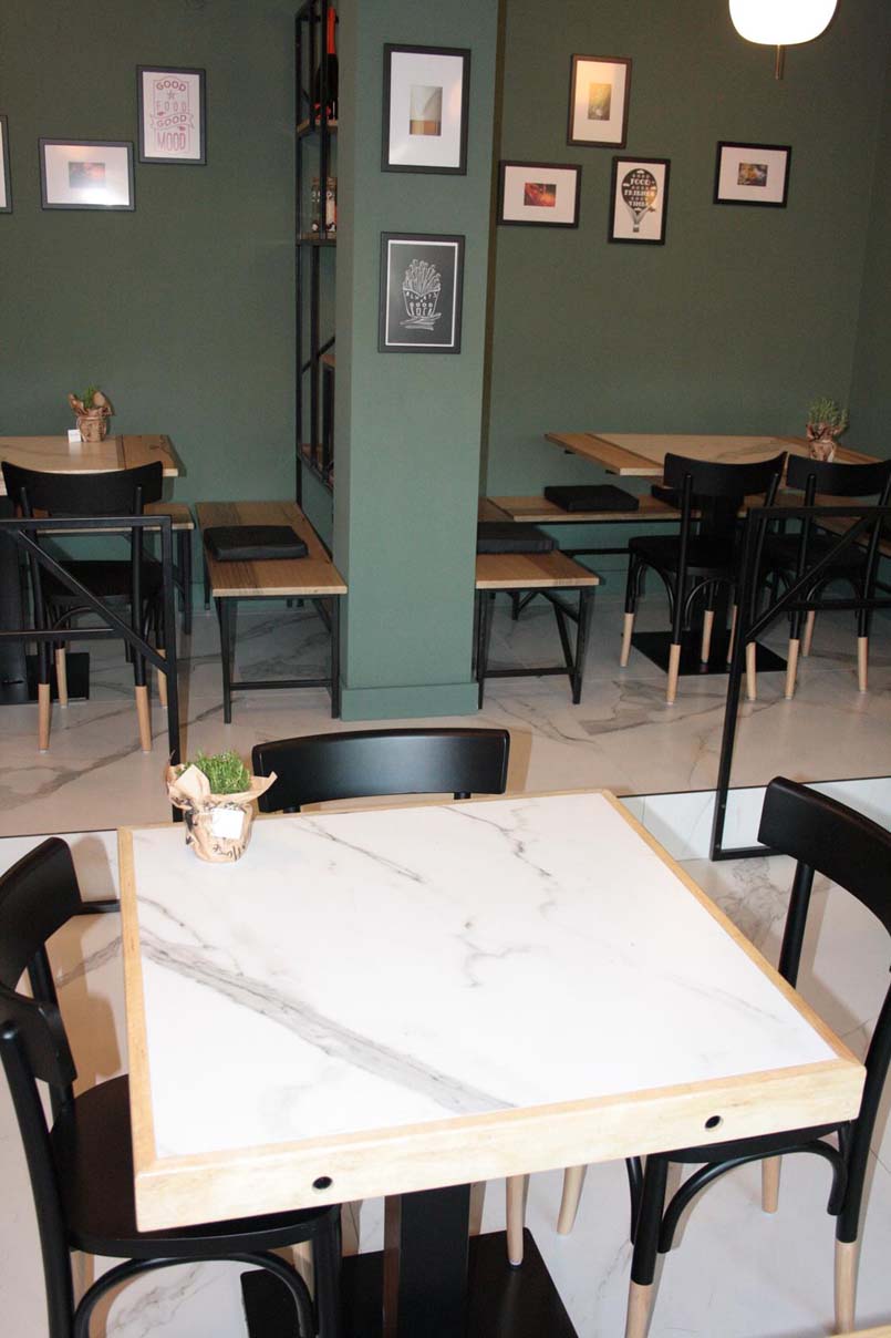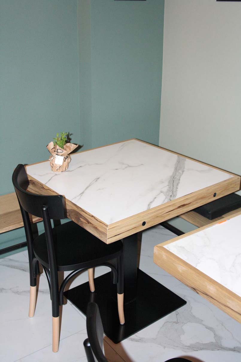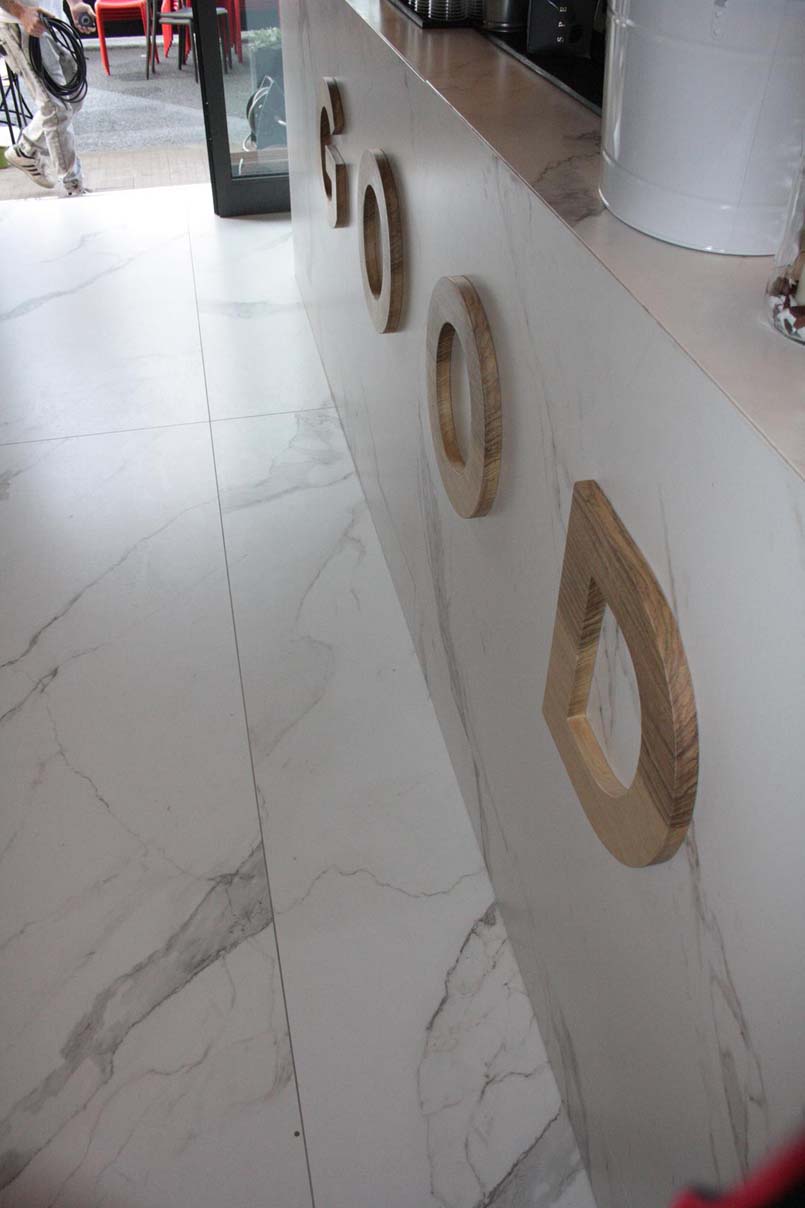 La collezione scelta è Timeless Marble Calacatta Gold Extra, rivisitazione in chiave contemporanea di uno dei marmi più preziosi esistenti in natura. Sulle grandi lastre con spessore di 5,5mm e grandi formati, fino a 3m x 1m, le venature intense e piene restituiscono superfici luminose ed eleganti. Il bianco lucente delle lastre diventa l’elemento d’arredo chiave dell’intero spazio. Slimtech ricopre tavoli, bancone bar, vassoi fino all’insegna con il logo: la versatilità del materiale ceramico si trasforma in concreta possibilità di sperimentare sempre nuovi ambiti di applicazione.