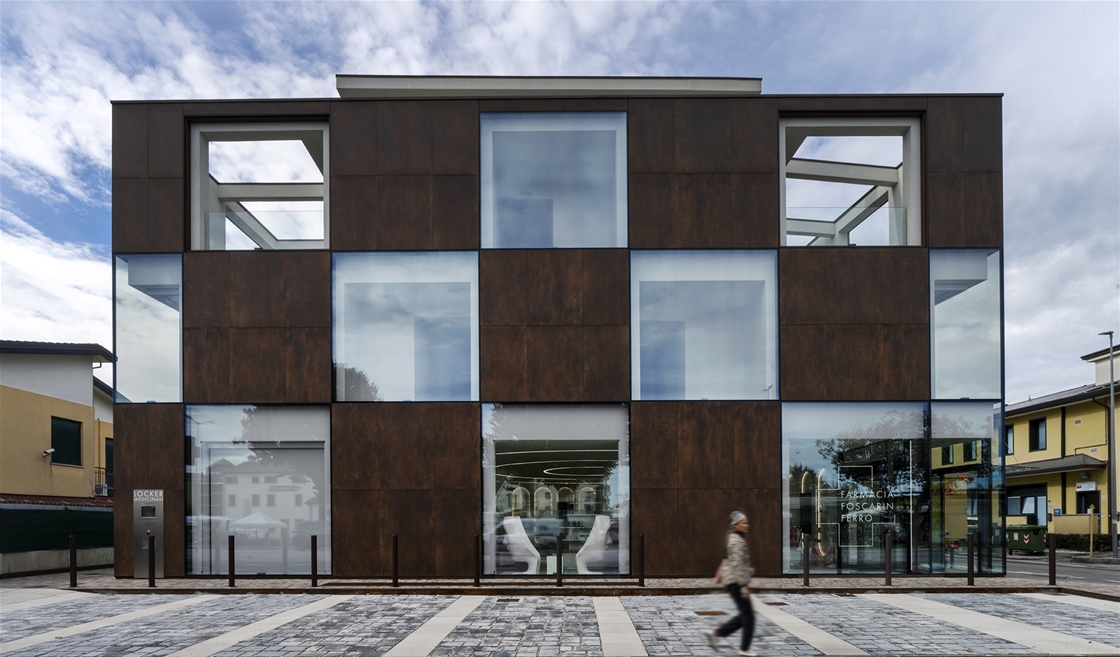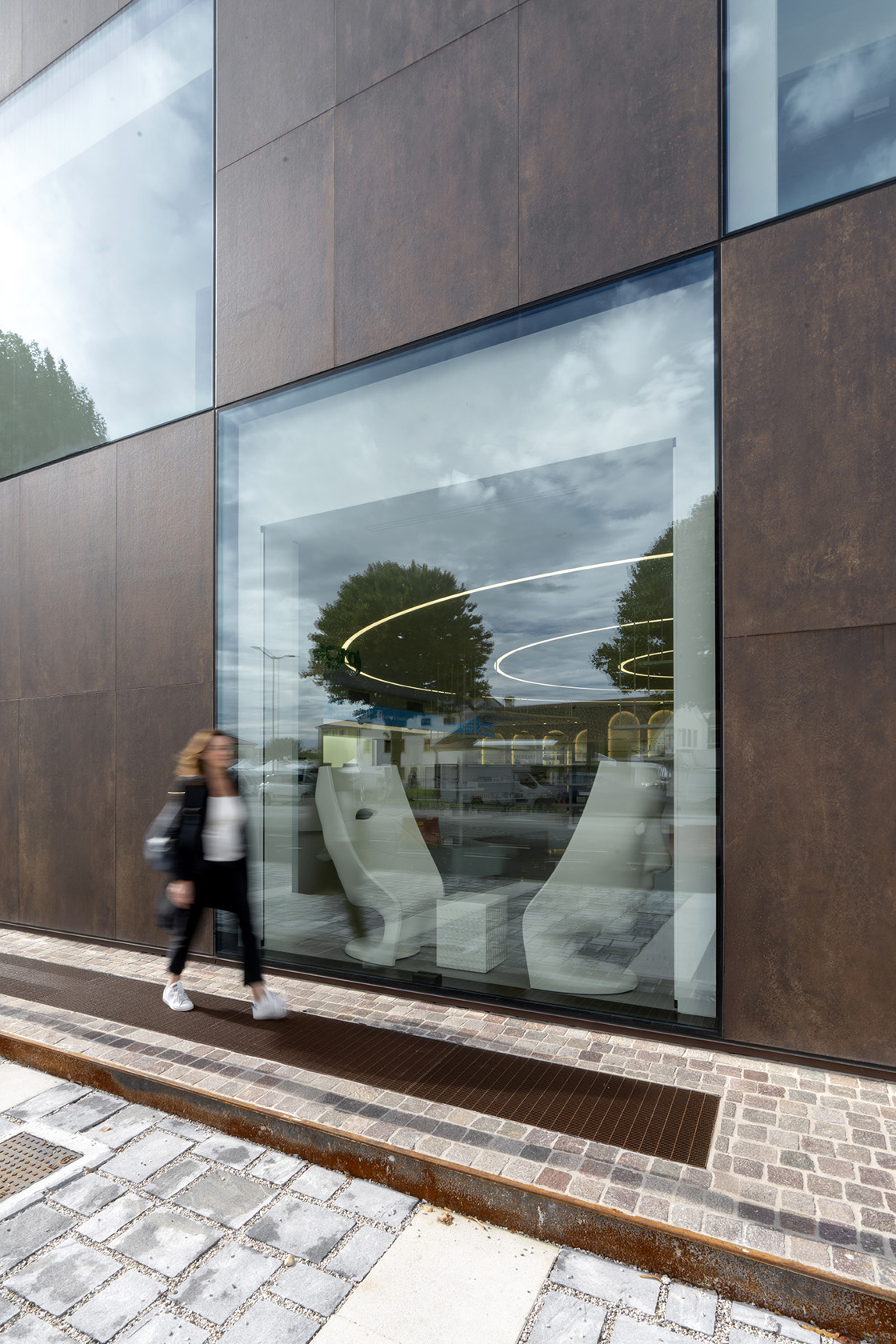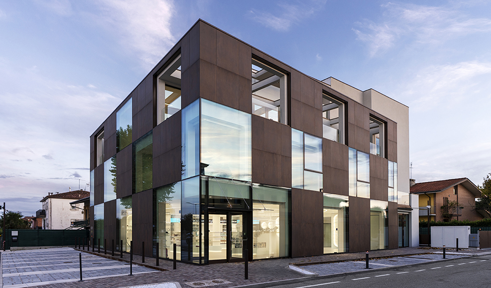L’identità dell’edificio trova una prima espressione nella facciata, concepita come un dinamico cubo di Rubik: lastre Slimtech 6 mm, nella nuance Rust, si alternano alle vetrate in un gioco di pieni e vuoti che racconta la resistenza e la leggerezza delle superfici anche in ambienti esterni. All’interno, le soluzioni ceramiche rafforzano la narrazione architettonica. Nella Farmacia Foscarin Ferro, il layout ispirato ai giardini all’italiana è valorizzato dalla tonalità Light, scelta per amplificare la luminosità e la percezione di armonia degli spazi. Lo stesso tono è stato adottato anche per i rivestimenti degli ambulatori ai piani superiori, garantendo un continuum estetico sobrio e rassicurante. Nelle aree di servizio – bagni e magazzino interrato, dove opera un sistema robotizzato per la gestione dei farmaci – è stato utilizzato il formato 90x90 cm con spessore 9 mm. Per la terrazza esterna è stata invece selezionata la versione L2 da 20 mm, sempre nella tonalità Light e con finitura Grip, per assicurare massima sicurezza e coerenza visiva.