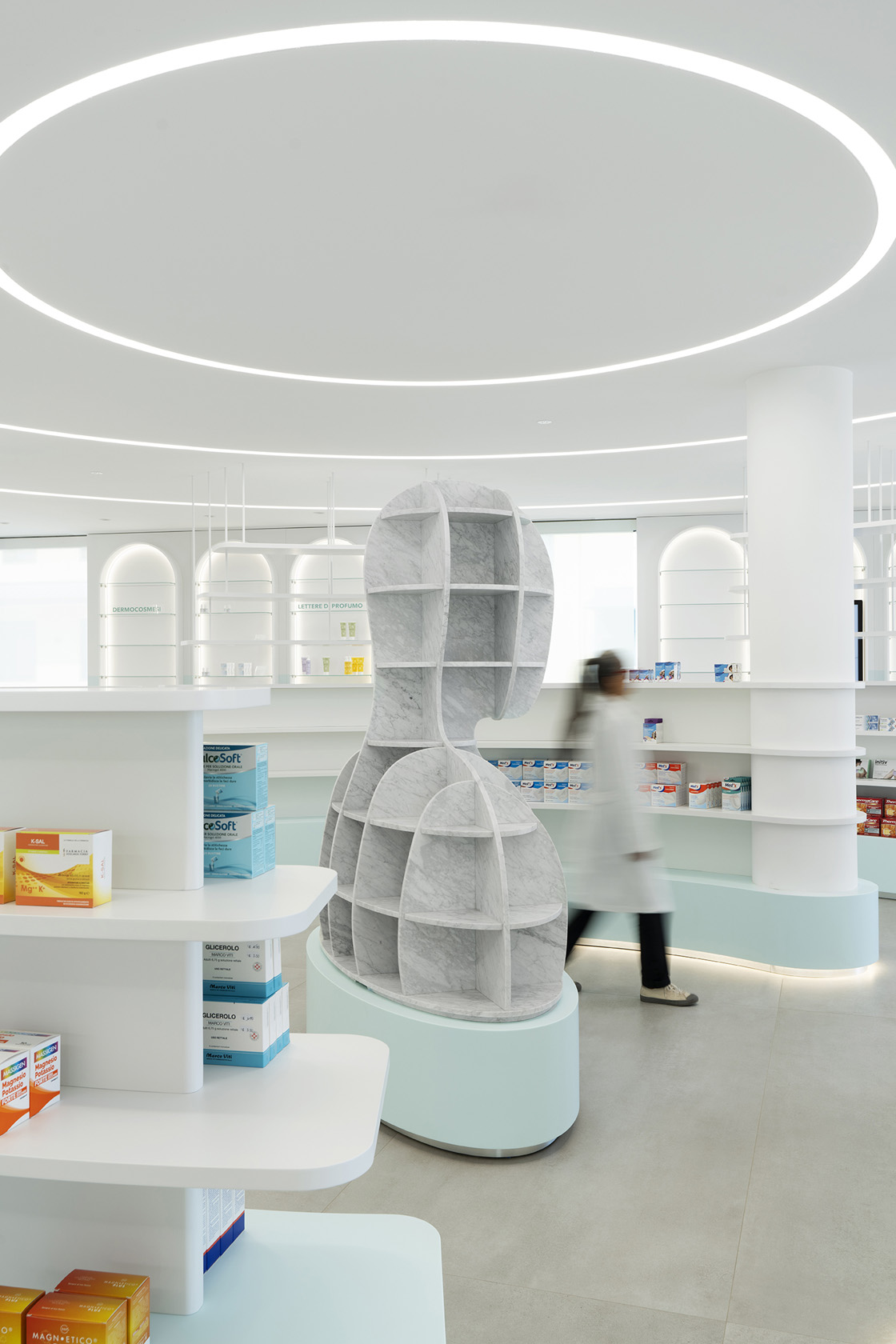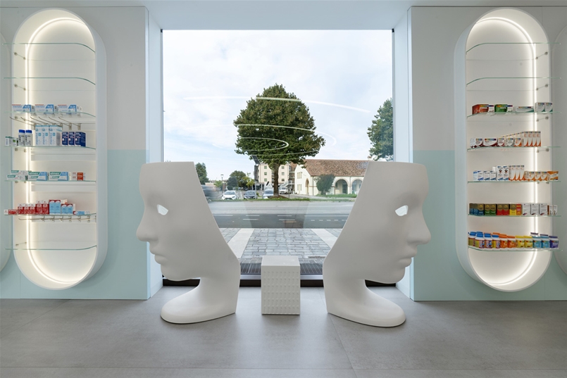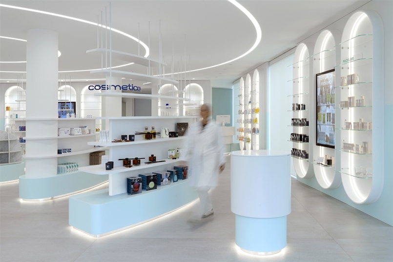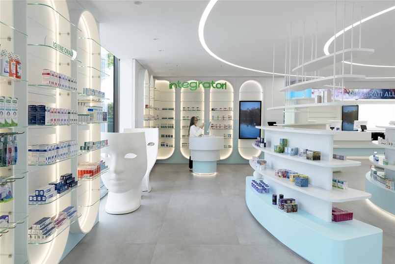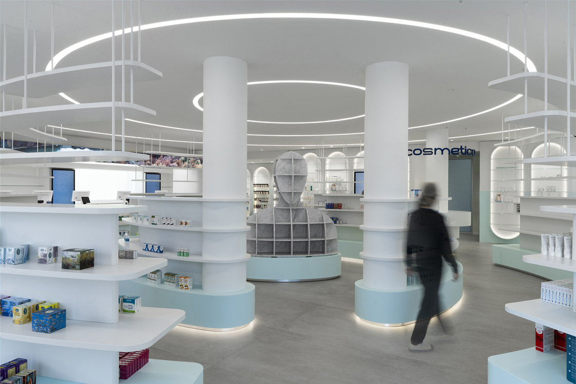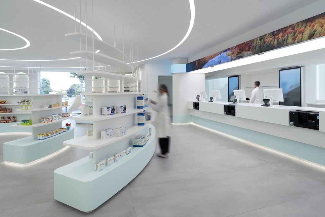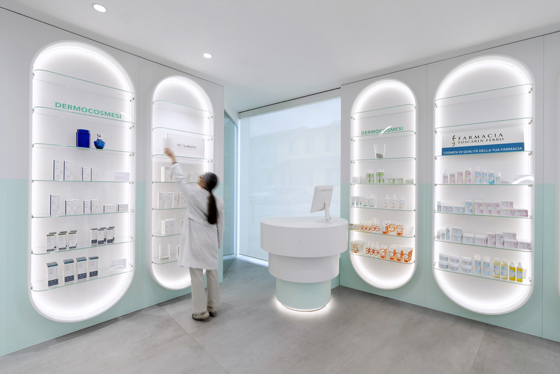 Firmato da Tecnostudio Padova, il complesso si articola su più livelli e ospita ambulatori, aree diagnostiche e una farmacia. Proprio quest’ultima, la Farmacia Foscarin Ferro, rappresenta il cuore concettuale del progetto: collocata al piano terra e firmata da Novembre Studio, è concepita come uno spazio relazionale in cui cura, consulenza e benessere trovano espressione in un’esperienza spaziale immersiva e coinvolgente.