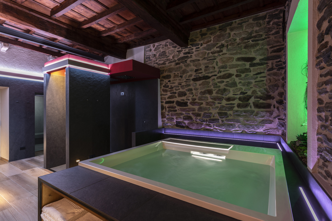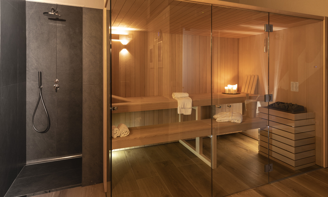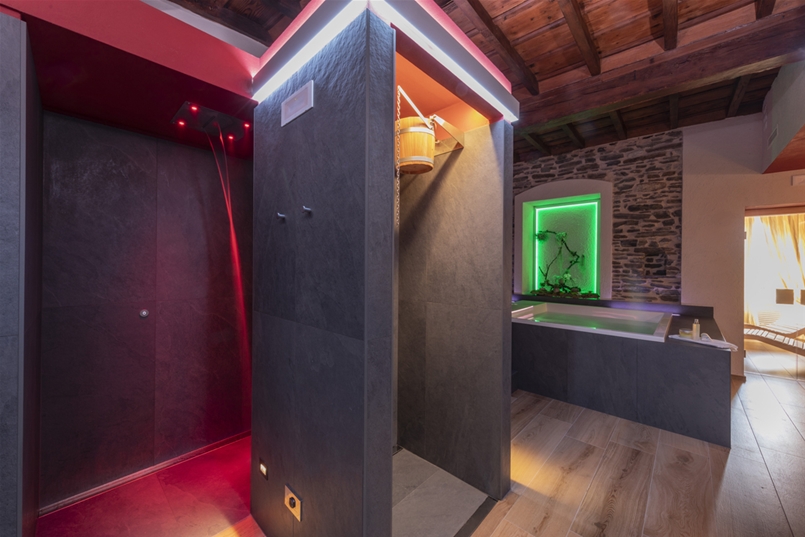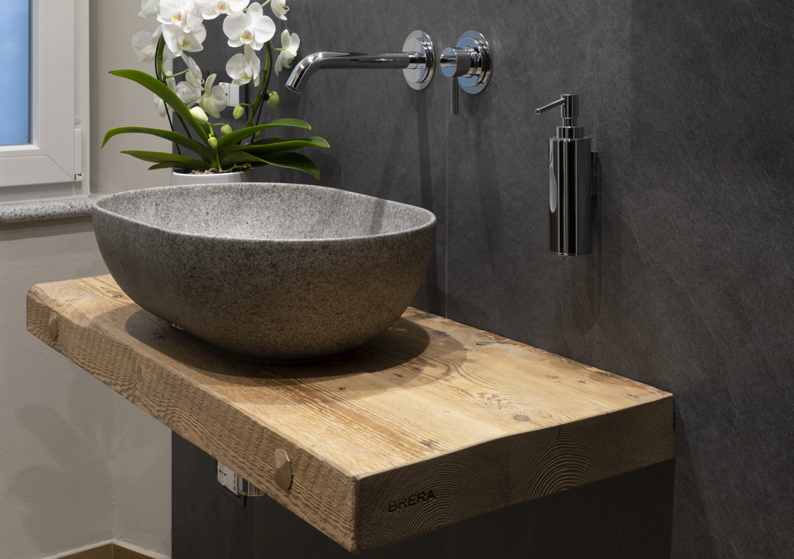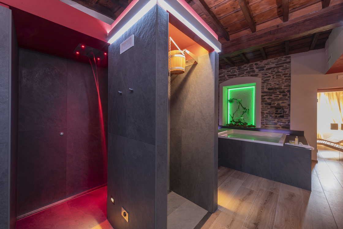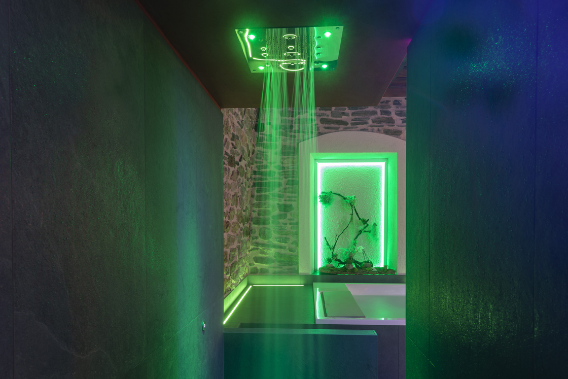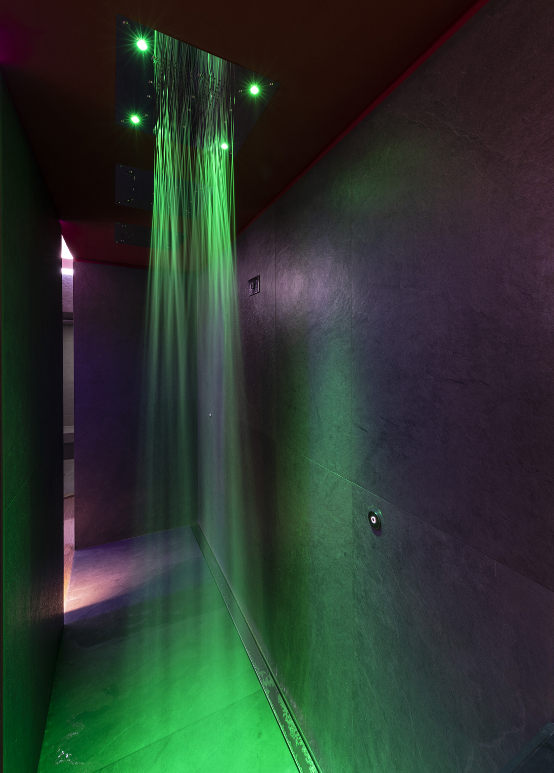Oltre a Bio Select, è Waterfall di Lea Ceramiche a rivestire alcune aree della zona wellness. Attraverso la fedele riproduzione dell’ardesia, la collezione registra il movimento delle venature e le irregolarità tipiche di una pietra a spacco. Il realismo dei disegni sui grandi moduli ceramici esprime la ruvida autenticità della pietra, i segni del tempo impressi nella materia fanno da sfondo allo spazio perfettamente disegnato, forma e funzione coincidono. Bio Select e Waterfall, come tutti i materiali di Lea Ceramiche e i suoi sistemi di produzione, soddisfano criteri sostenibili; sono salubri perché protetti da Protect®, la tecnologia che impedisce la proliferazione dei batteri; sono resistenti e facili da pulire. Grazie alla loro superficie non porosa, il materiale ceramico ostacola il deposito di sporco e la proliferazione di muffe, risultando così ideale per essere posato in ambienti a elevata frequenza.