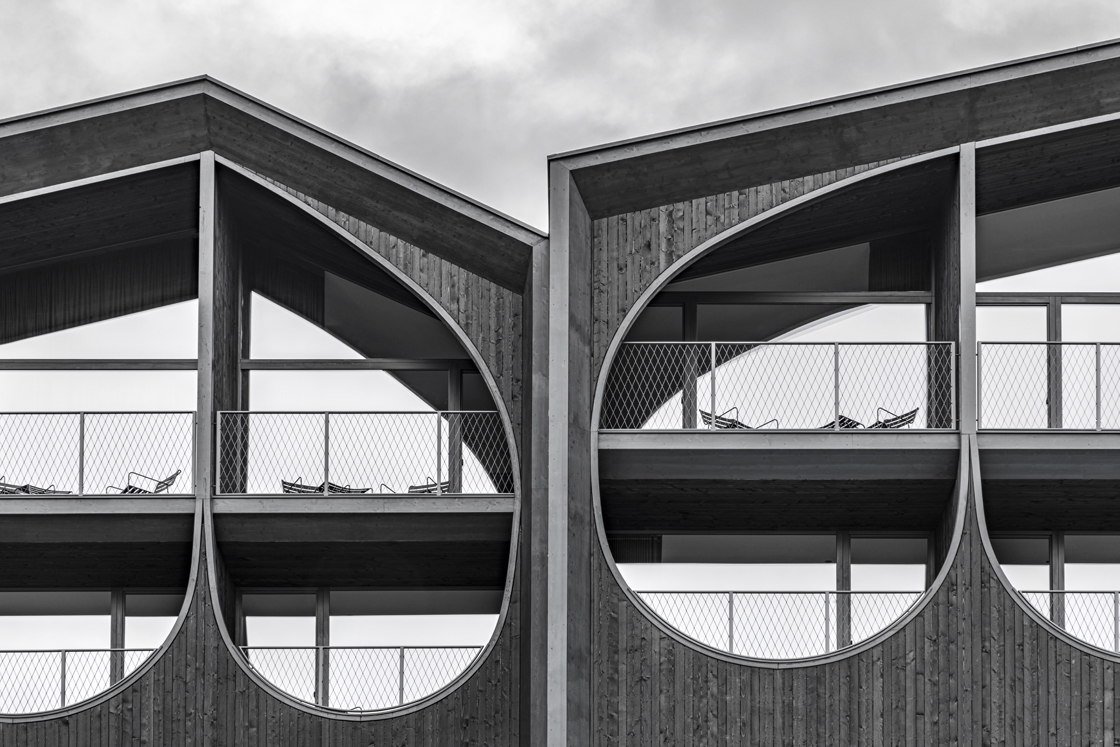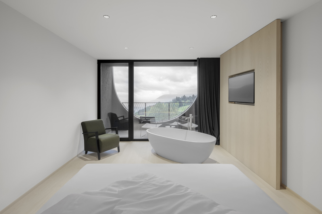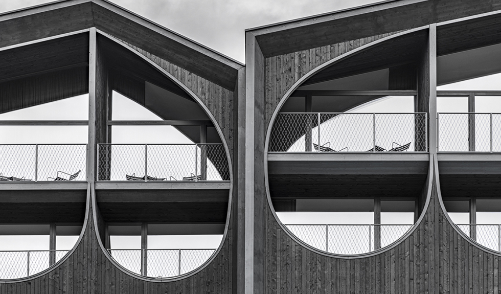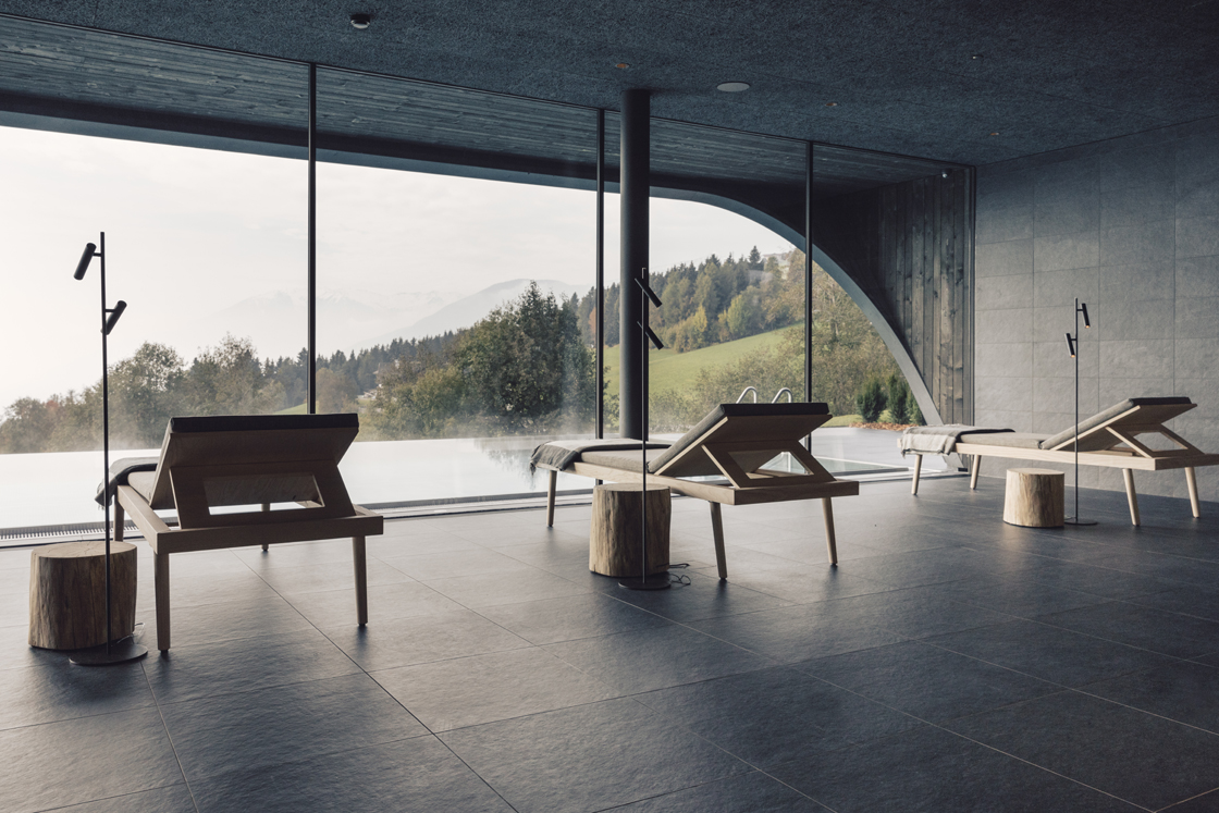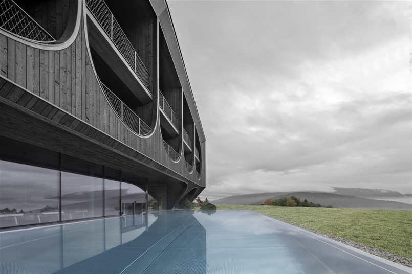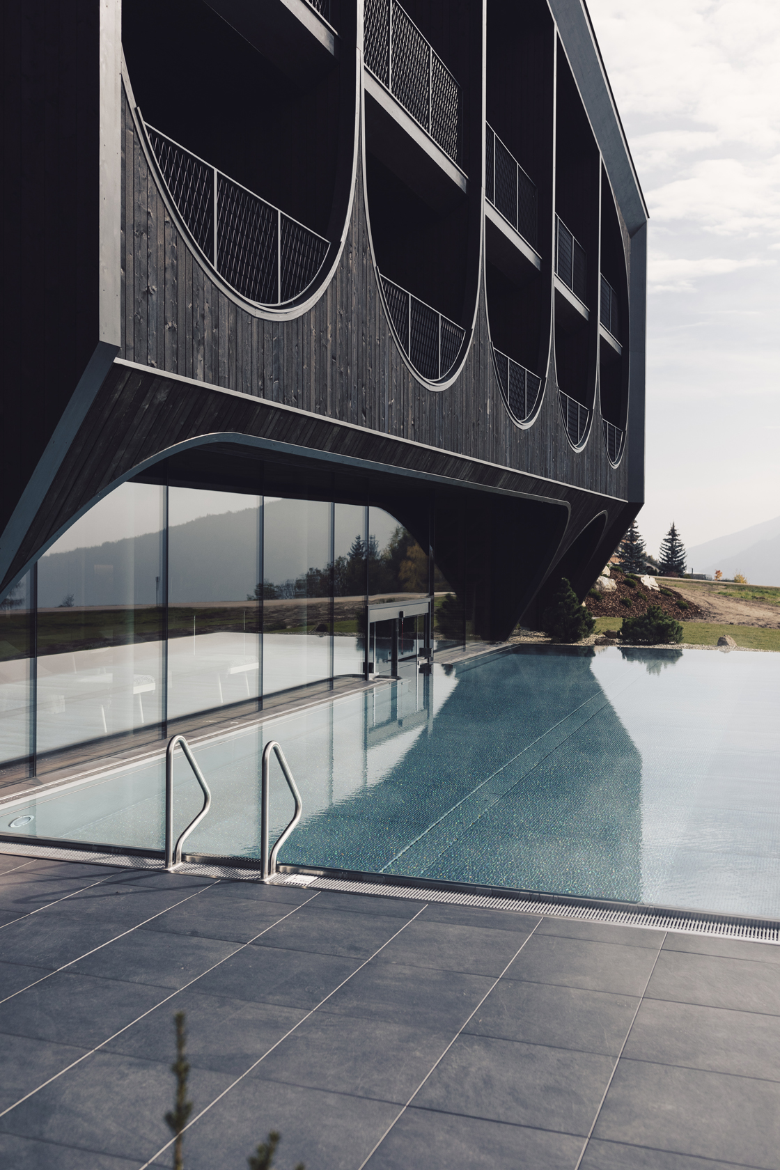 Firmato dallo studio Peter Pichler Architecture, l’hotel rappresenta un esempio tangibile di edilizia sostenibile impreziosita da un design raffinato e contemporaneo. Un’architettura moderna che si sviluppa attraverso quattro volumi sfalsati, caratterizzati da un rivestimento in larice nero e da grandi tagli ricurvi sulle facciate che creano uno stretto rapporto tra interno ed esterno, tra artificio e natura.