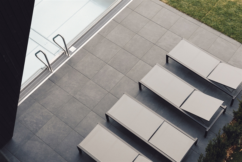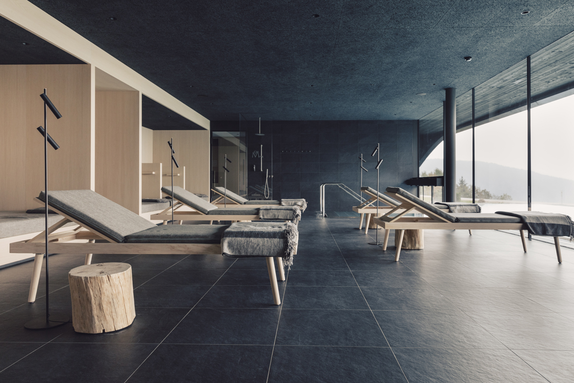 In linea con il concept ecologico del progetto, in tutti gli spazi ricorrono materiali ecosostenibili. Per i rivestimenti ad esempio è stata scelta la collezione Waterfall di Lea Ceramiche, un prodotto ceramico che reinterpreta, in modo realistico, una pietra naturale come l’ardesia. Nel colore Dark Flow, Waterfall ricopre le superfici degli ambienti bagno e delle aree Spa, conferendo naturalità ed eleganza; resistente e facile da pulire, si contraddistingue anche per la protezione antibatterica Protect®, che garantisce la massima salubrità degli spazi. Nella versione con spessore di 20mm, più robusta e resistente, ricopre le aree esterne, integrandosi perfettamente con il linguaggio formale degli interni in continuità con lo stile essenziale e minimalista della struttura.