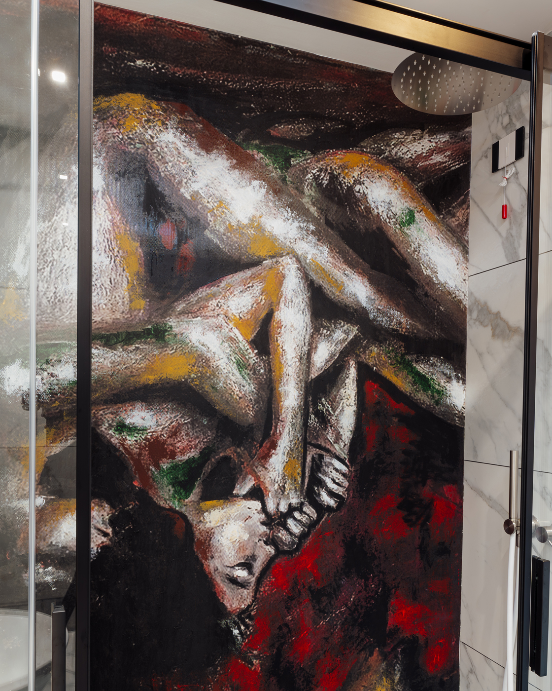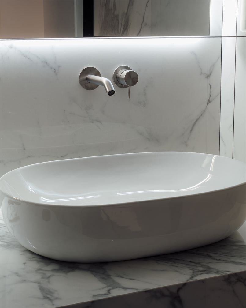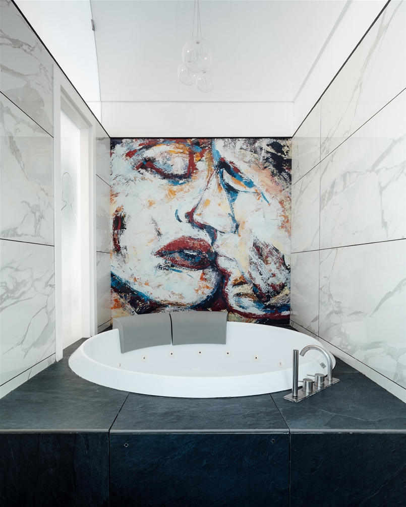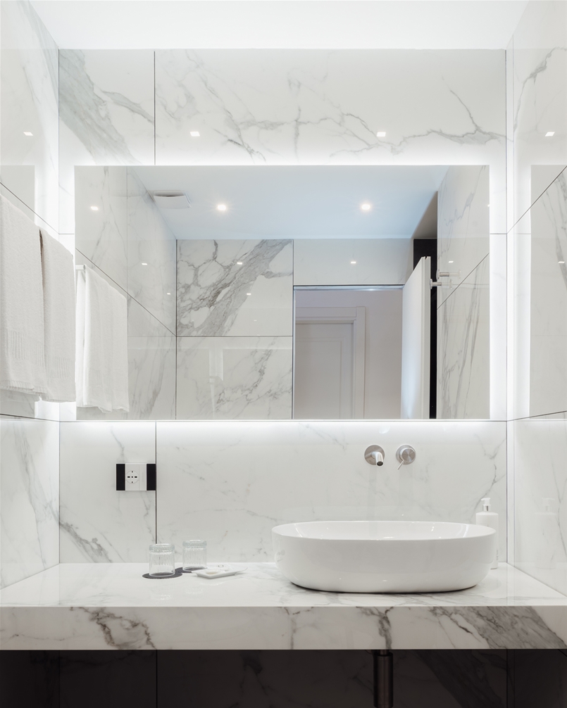 Per i pavimenti e i rivestimenti di alcune delle camere è stata utilizzata Noblesse nella nuance Pure Statuario e nel formato 120x278 e 60x120 cm, una collezione che, come il fenomeno percettivo da cui trae il nome, risveglia la vista e il tatto: un viaggio nella materia attraverso sensi che si contaminano, si sovrappongono e si confondono per vedere la morbidezza della superficie e toccare l’intensità delle venature che la attraversano. Le pietre marmoree della collezione, scelte tra le più pregiate, sono state sapientemente riprodotte in Slimtech, il gres porcellanato laminato di grande formato (fino a 120x278 cm) con spessore 6mm.