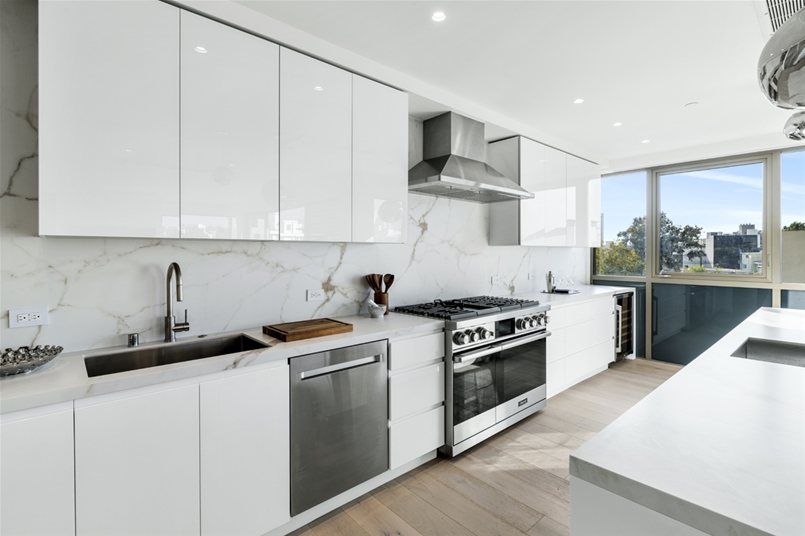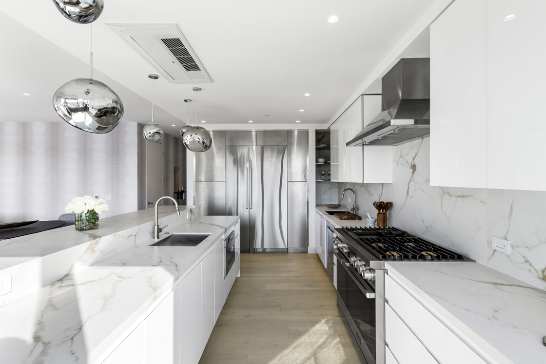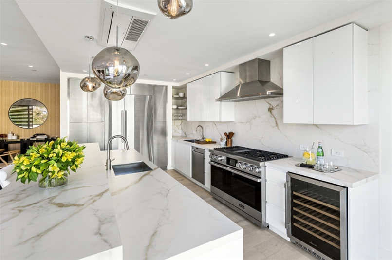 Per la cucina, lo studio di progettazione ha optato per un backsplash realizzato con la collezione Noblesse, nella preziosa nuance Calacatta Oro e nel formato 120x278 cm e spessore 6mm, collezione che interpreta un materiale naturale e antico come il marmo con una consapevolezza nuova, in sintonia coi codici stilistici più attuali. L’isola della cucina è stata, invece, rivestita con le lastre del brand MAXA, anch’esso appartenente a Panariagroup e specializzato nelle grandi lastre spessorate 12mm in formato 160x320 cm.