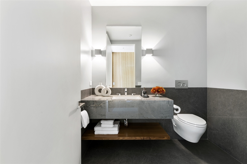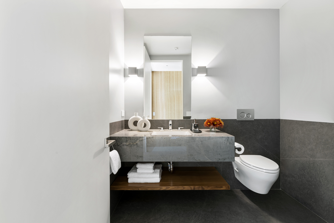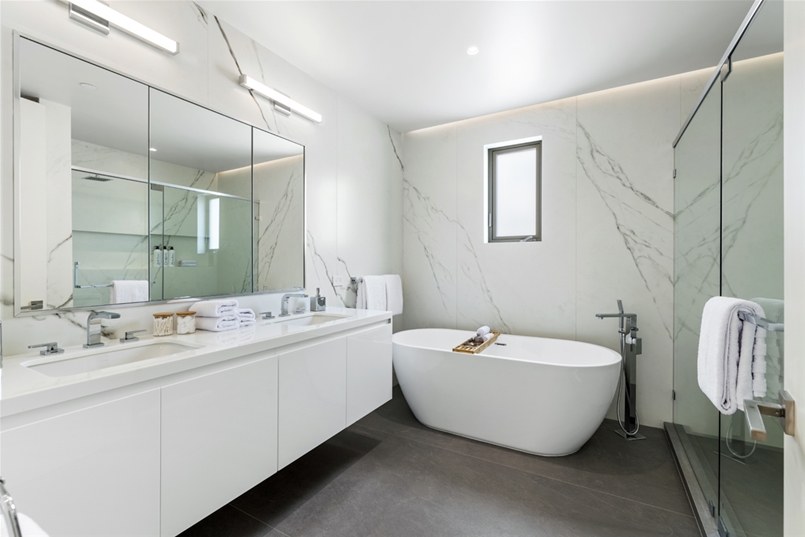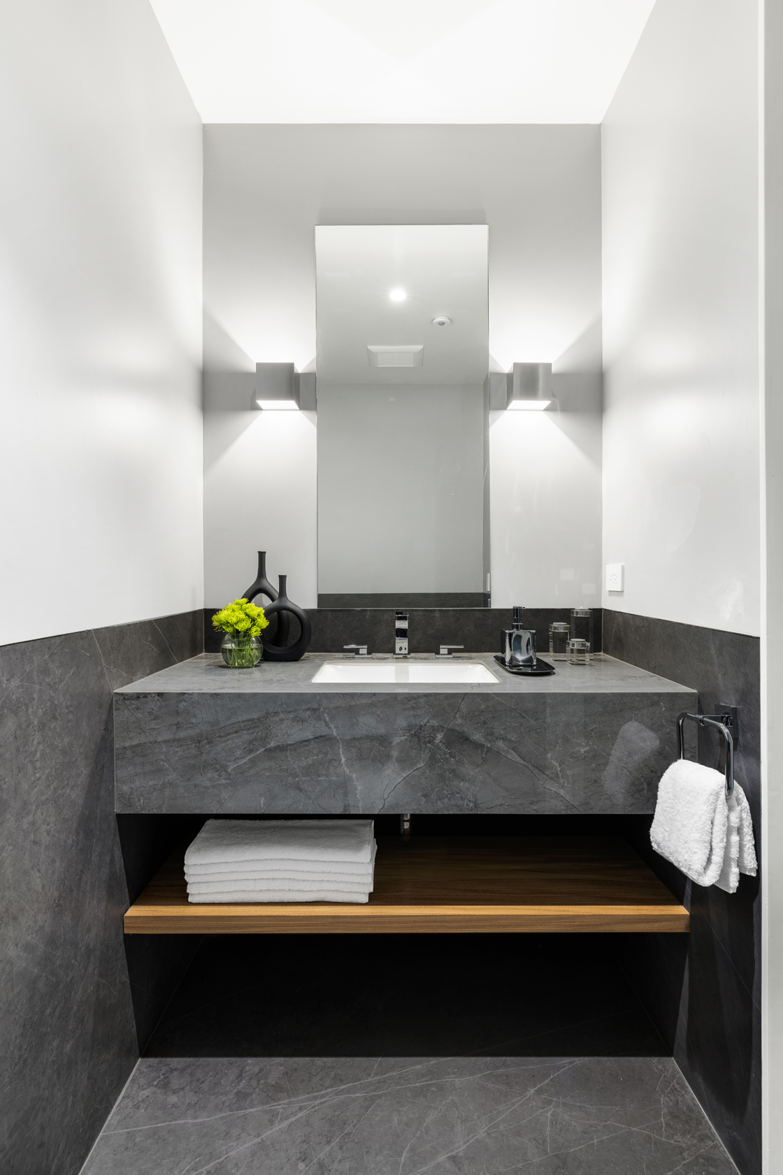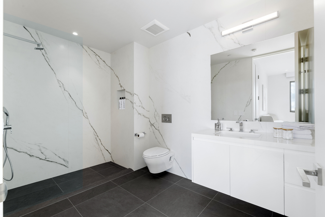 Infine, per i servizi è stata utilizzata a rivestimento, nell’elegante colore Statuario White, la collezione effetto marmo Timeless Marble nel formato 100x300 cm e spessore 6mm, in grado di aggiungere fascino agli ambienti e di interpretare il marmo come uno scrigno di eleganza. A pavimento, invece, è stata impiegata Waterfall, nel colore Dark Flow e nel formato 60x60 cm e spessore 9,5mm: una collezione in grado di ricreare sulla superficie del grès gli effetti cangianti tipici delle pietre rocciose sedimentarie registrando texture, irregolarità e variazioni di colore.