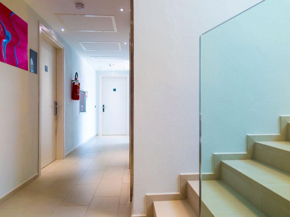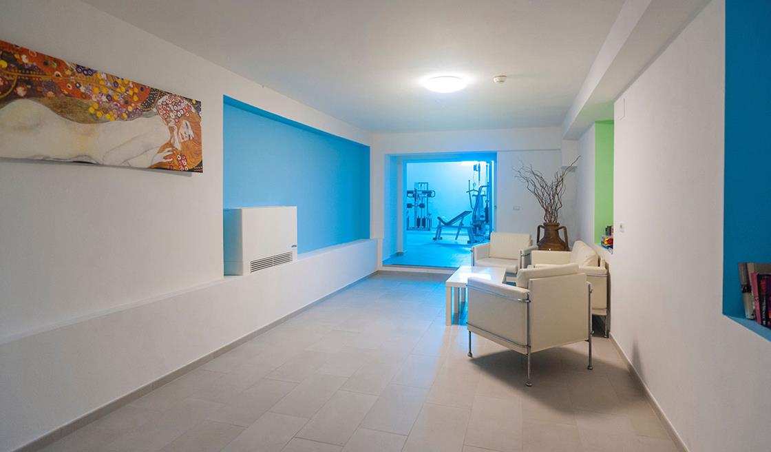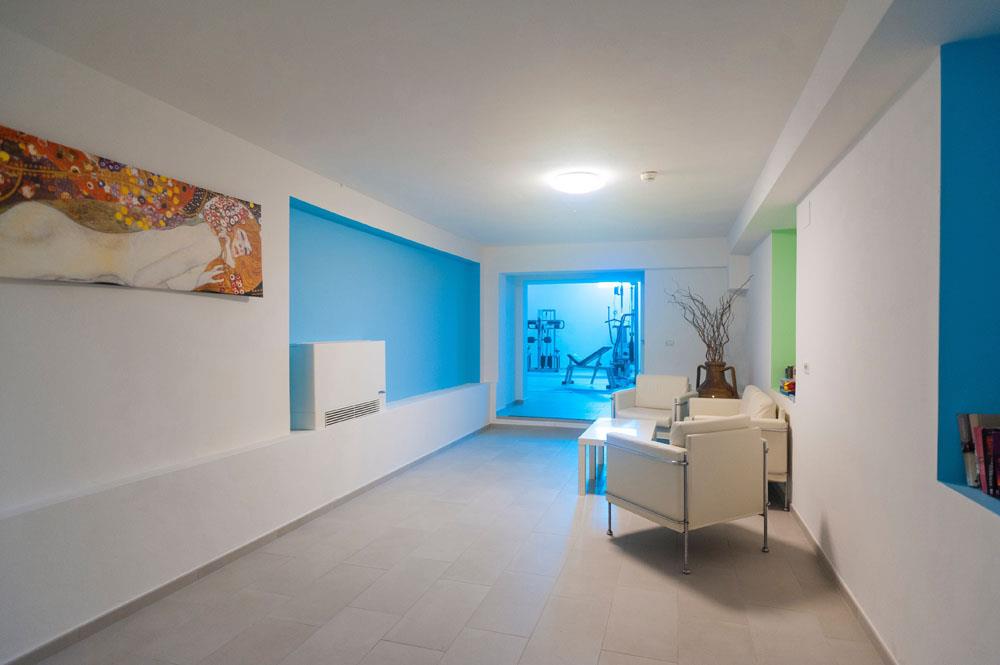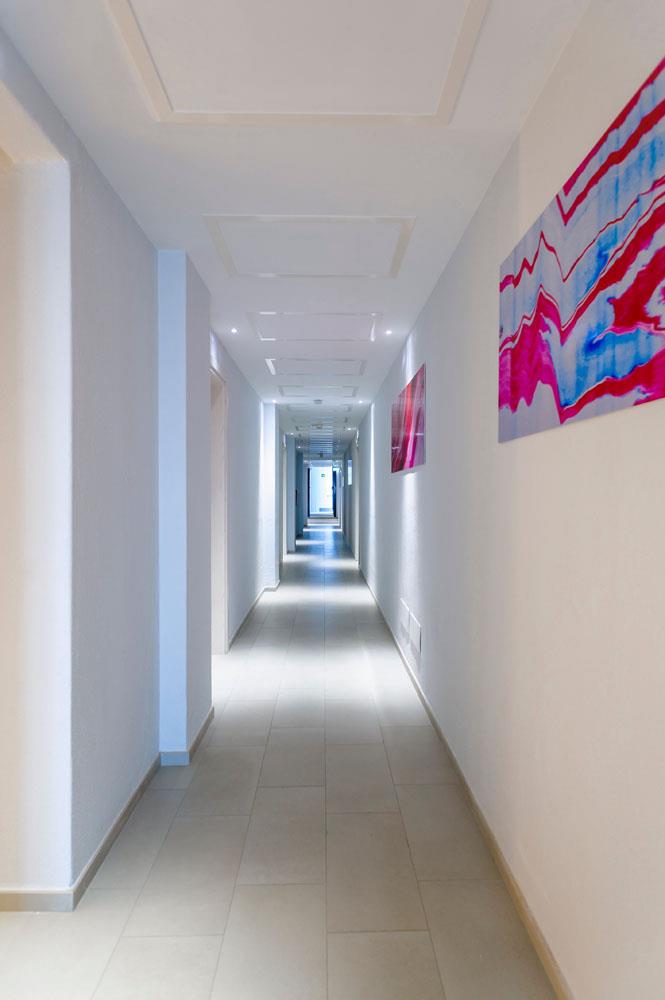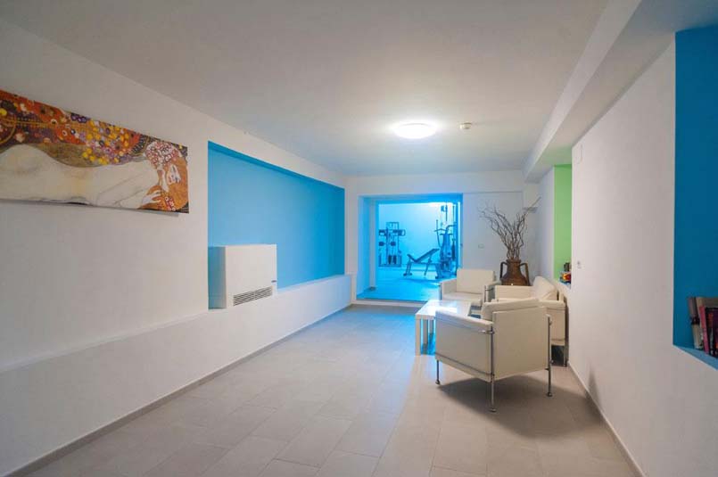 Nelle camere e corridoi è stato scelto a pavimento il colore Tokyo White di Metropolis, i bagni sono rivestiti con Kensington e all’esterno (piscina e zona relax) due colori di Basaltina Stone Project: sabbiata e scalpellata.
